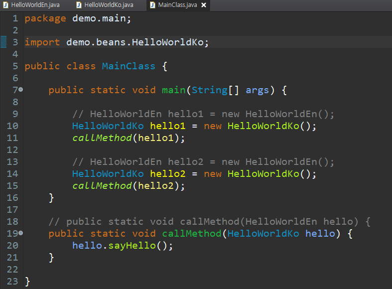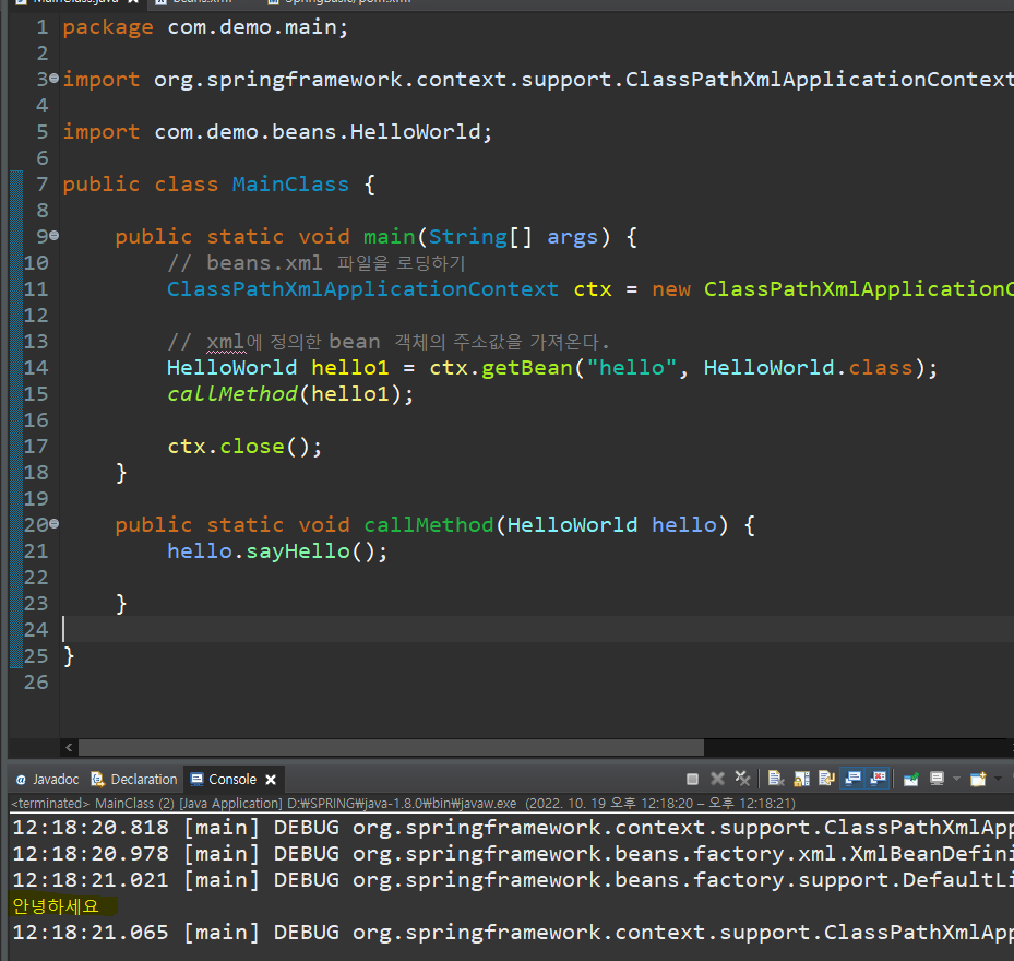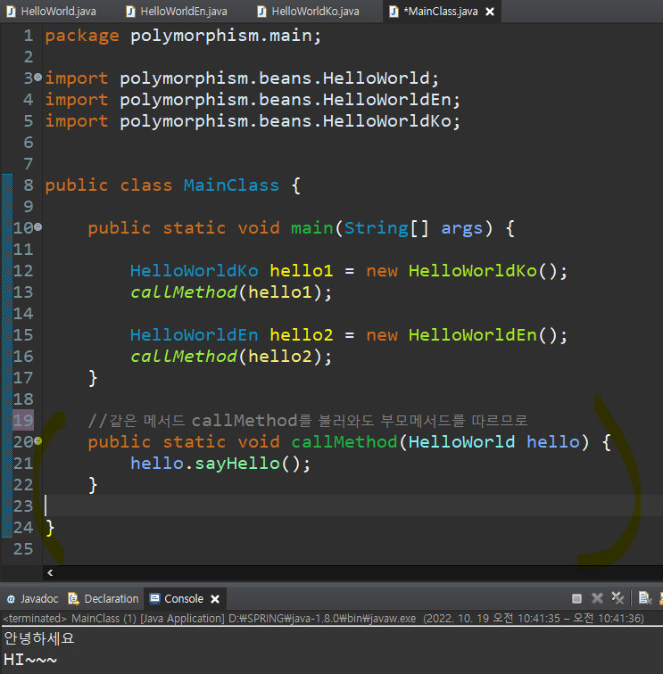 등록된 bean 객체만 En으로 변경하고 MainClass 실행 => En 메서드 실행됨