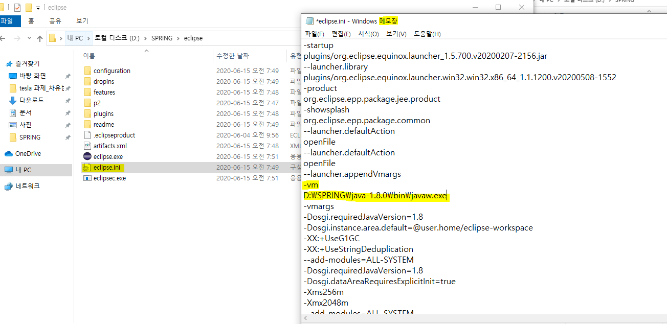 eclipse.ini 파일을 메모장으로 열어서 위의 경로 추가해줘야함
