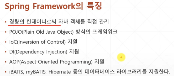 - JAVA 기반의 프레임워크로서 여러 모듈로 구성되어 있는데, 이중 웹 어플리케이션을 만들고자 등장한게 SpringMVC 모듈 (SpringFramework는 웹 프레임워크가 아님)