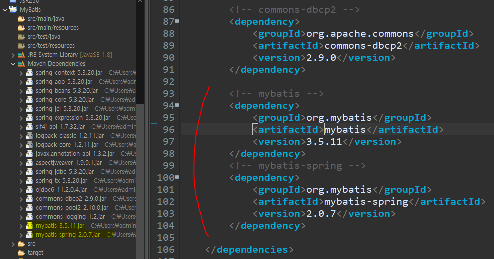 MyBatis 프로젝트 생성 후 mybatis , mybatis-spring 디펜던시 추가