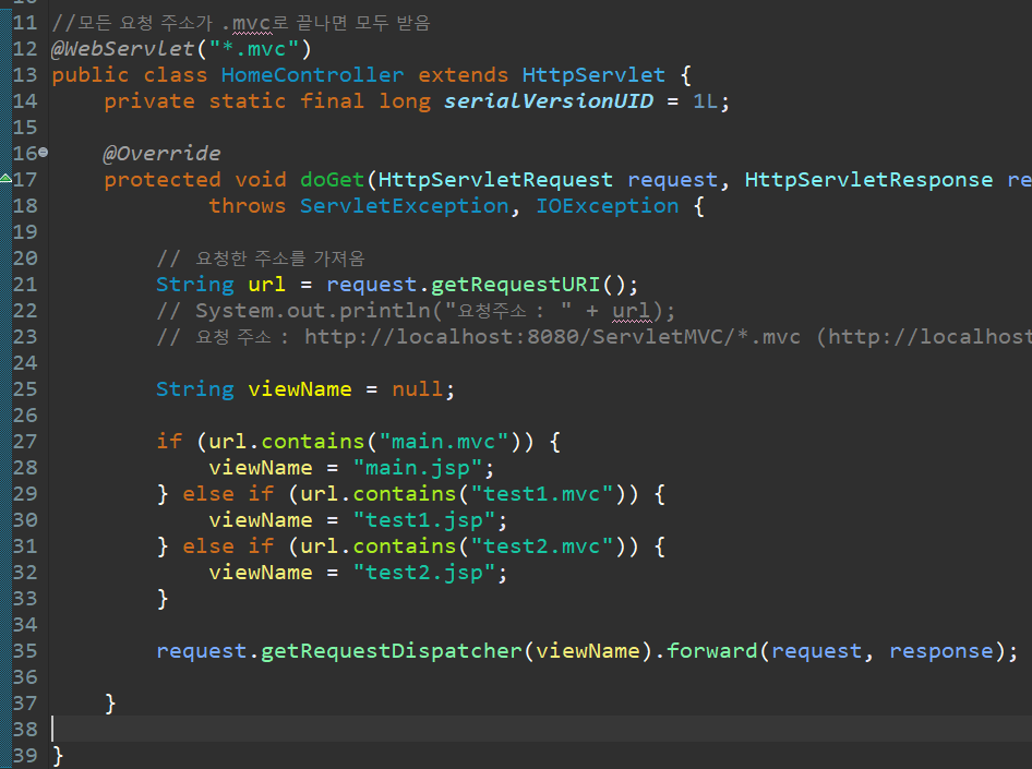 1. 컨트롤러 서블릿에서 요청 주소를 체크해서 포워드(request를 유지)