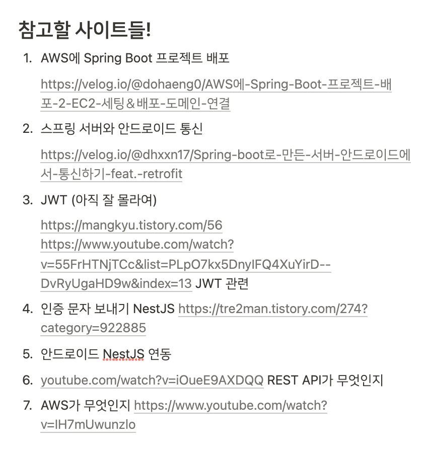 백엔드 팀에게는 "안드랑 백 알아보기 (NestJS, Spring 각각) 백엔드 2개, MySQL 1개, 안드로이드 1개, AWS 사용법알아오기" 숙제가 주어졌습니다~~!