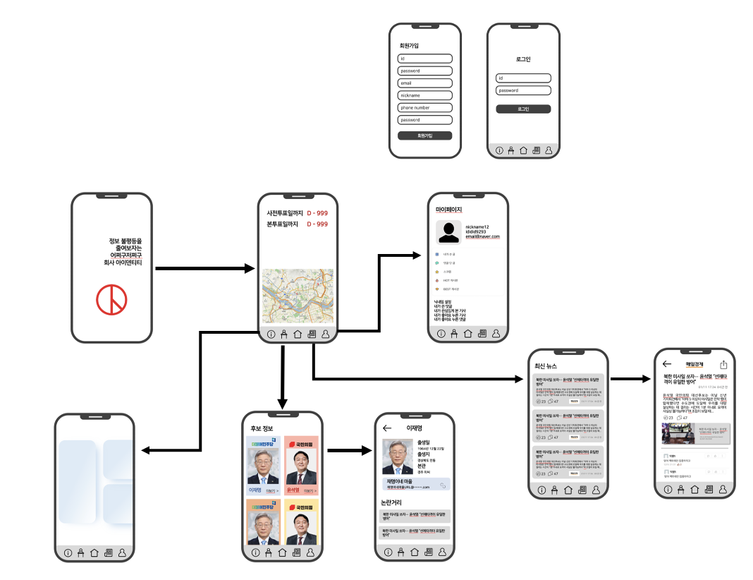 - 후보 리스트 보여주고 후보들 공약 알려주기, 후보들의 사건(의혹 넣자),