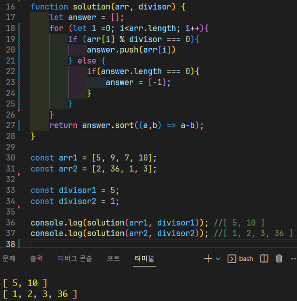 그래서 나누어 떨어지는 값을 오름차로 배열하는 조건문에 else if로 element가 하나도 없다면 -1을 반환하는 것까지 넣은 것이었다.