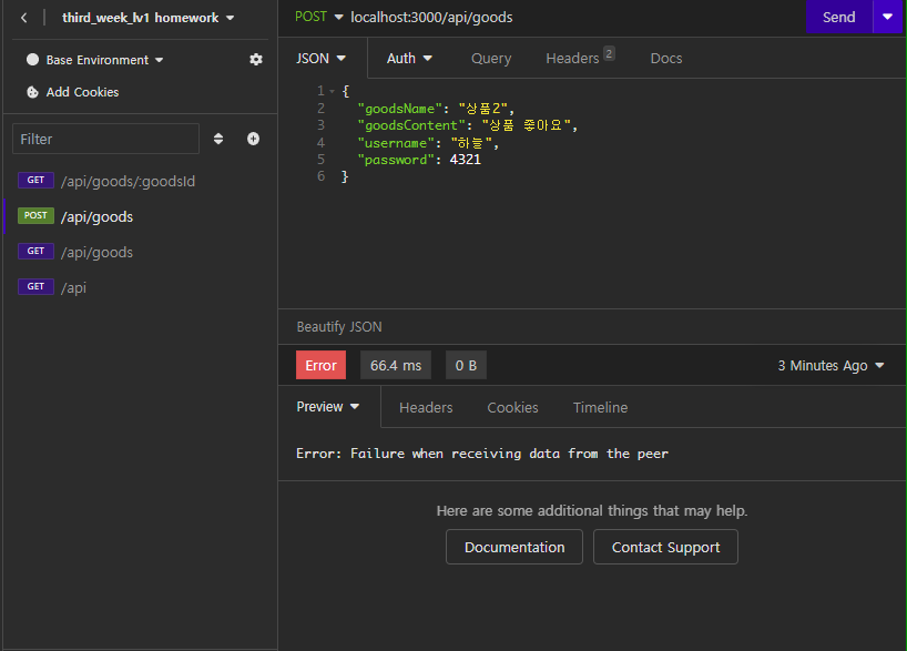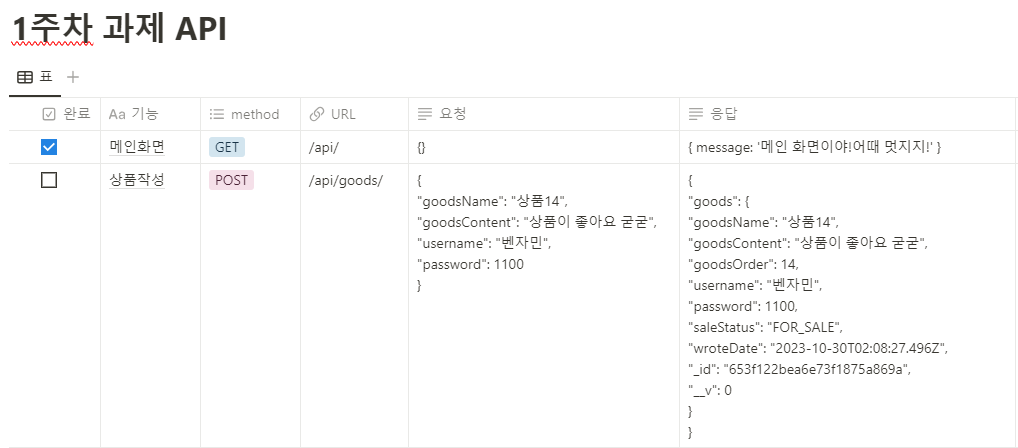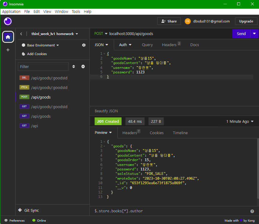 const currentGoods = await Goods.findById(goodsId).exec(); if (!currentGoods) { return res.status(400).json({ errorMessage: "상품 조회에 실패하였습니다." }); };3.password이 불러온 currentGoods의 password와 비교하여 틀리면 에러메시지를 보내고 아니라면 _id가 currentGoods인걸 하나 지운다. 그 후 응답으로 빈 객체를 보낸다.