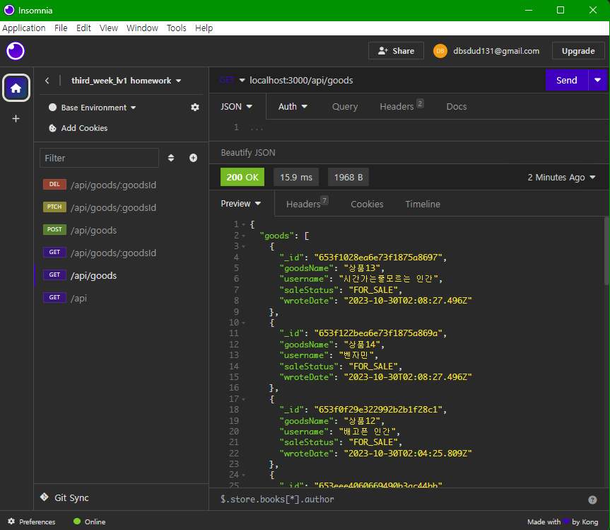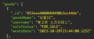 goodsId로 Goods 모델(스키마)에서 필요한 필드명들로 찾고 wroteDate를 이용해 내림차 정렬을 해준다. 정렬해준 값을 goodsItem에 할당하여 응답으로 보내준다.const goodsItem = await Goods.findById(goodsId).select('goodsName goodsContent username saleStatus wroteDate').sort('-wroteDate').exec(); return res.status(200).json({ goods: goodsItem });