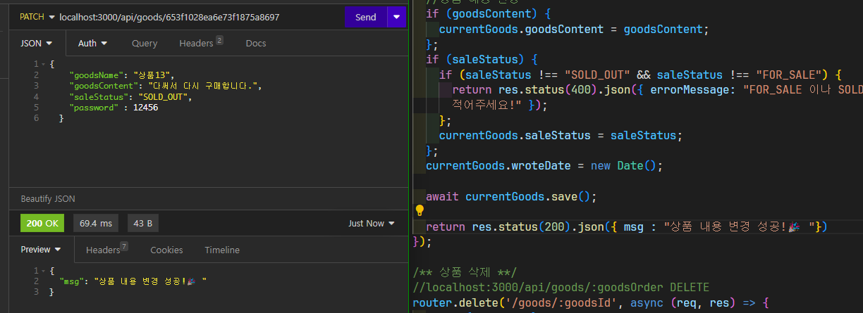 /** 상품 정보 수정 **/ //localhost:3000/api/goods/:goodsId PATCH router.patch('/goods/:goodsId', async (req, res) => { const { goodsName, goodsContent, saleStatus, password } = req.body; const { goodsId } = req.params; const currentGoods = await Goods.findById(goodsId).exec(); //선택한 상품 존재 X => 에러 메시지 응답 if (!currentGoods) { return res.status(404).json({ errorMessage: "상품조회에 실패하였습니다." }); }; //상품명, 비밀번호 일치 여부 확인 동일할 때만 수정되도록 if (password !== currentGoods.password) { return res.status(400).json({ errorMessage: "passaword가 맞지 않아요! " }); }; if (goodsName !== currentGoods.goodsName) { return res.status(400).json({ errorMessage: "상품 이름이 맞지않아요! " }); }; //상품 내용 변경 if (goodsContent) { currentGoods.goodsContent = goodsContent; }; if (saleStatus) { if (saleStatus !== "SOLD_OUT" && saleStatus !== "FOR_SALE") { return res.status(400).json({ errorMessage: "FOR_SALE 이나 SOLD_OUT만 적어주세요!" }); }; currentGoods.saleStatus = saleStatus; }; currentGoods.wroteDate = new Date(); await currentGoods.save(); return res.status(200).json({}) });부연설명