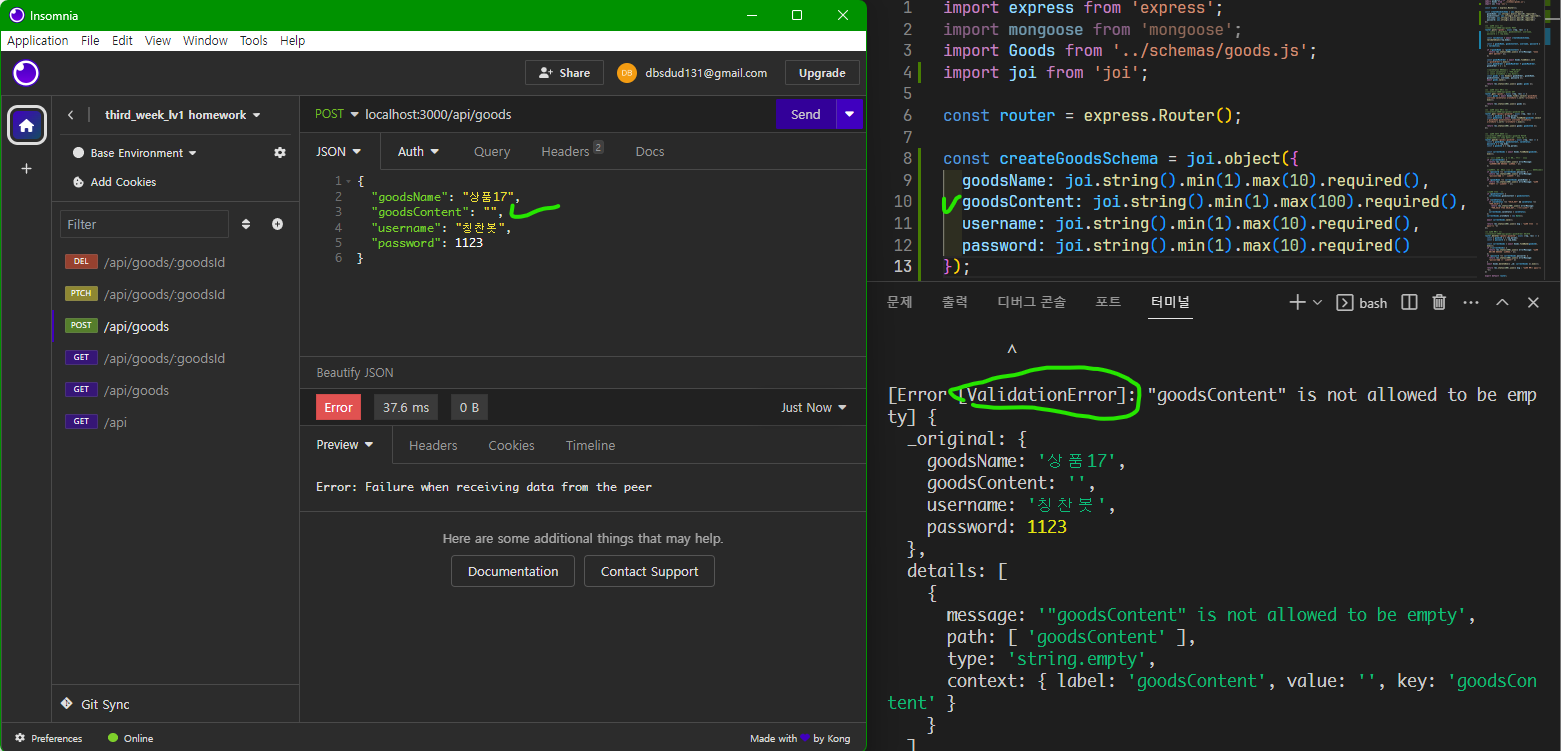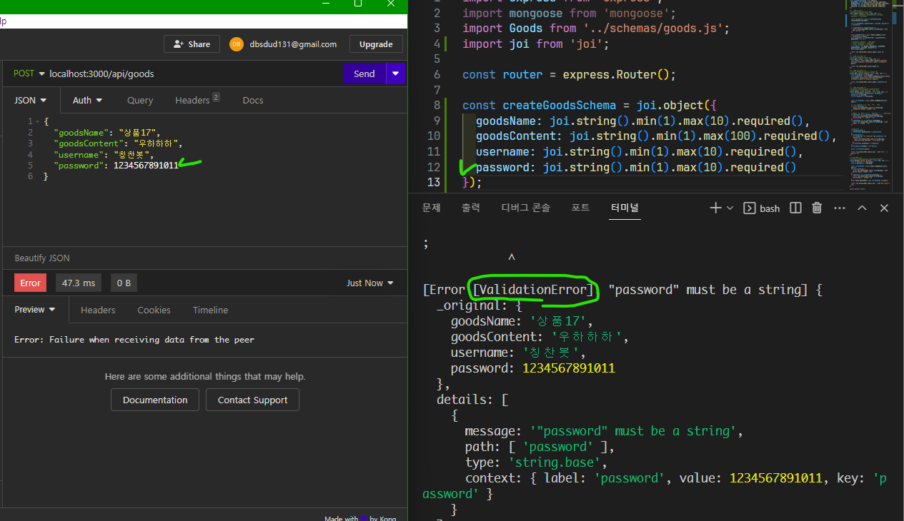 Joi의 데이터 유효성 검증을 실패한 코드에서 에러가 발생하는 경우에 대한 대응 방법