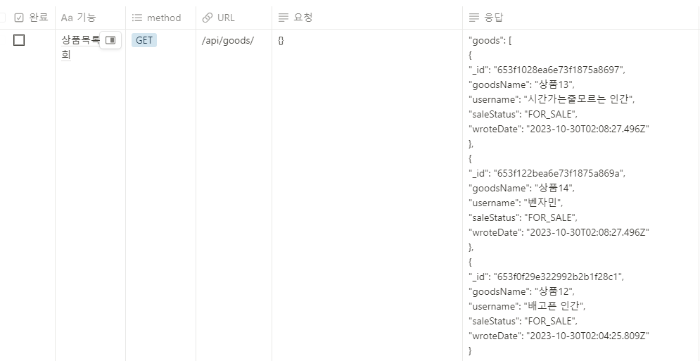 /** 상품 목록 조회 **/ //localhost:3000/api/goods GET router.get('/goods', async (req, res) => { const goods = await Goods.find().select('goodsName username saleStatus wroteDate').sort('-wroteDate').exec(); return res.status(200).json({ goods }); });부연설명