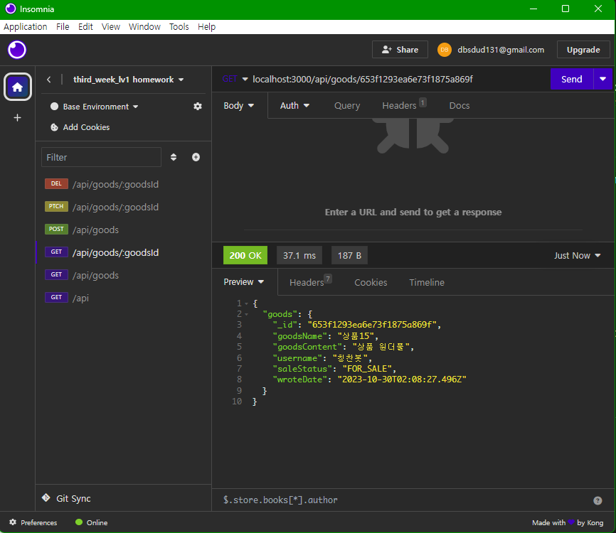 - Goods 모델(스키마)의 변경사항을 변수에 할당하여 저장한다. 그 후 클라이언트에게 저장한 내용으로 응답.