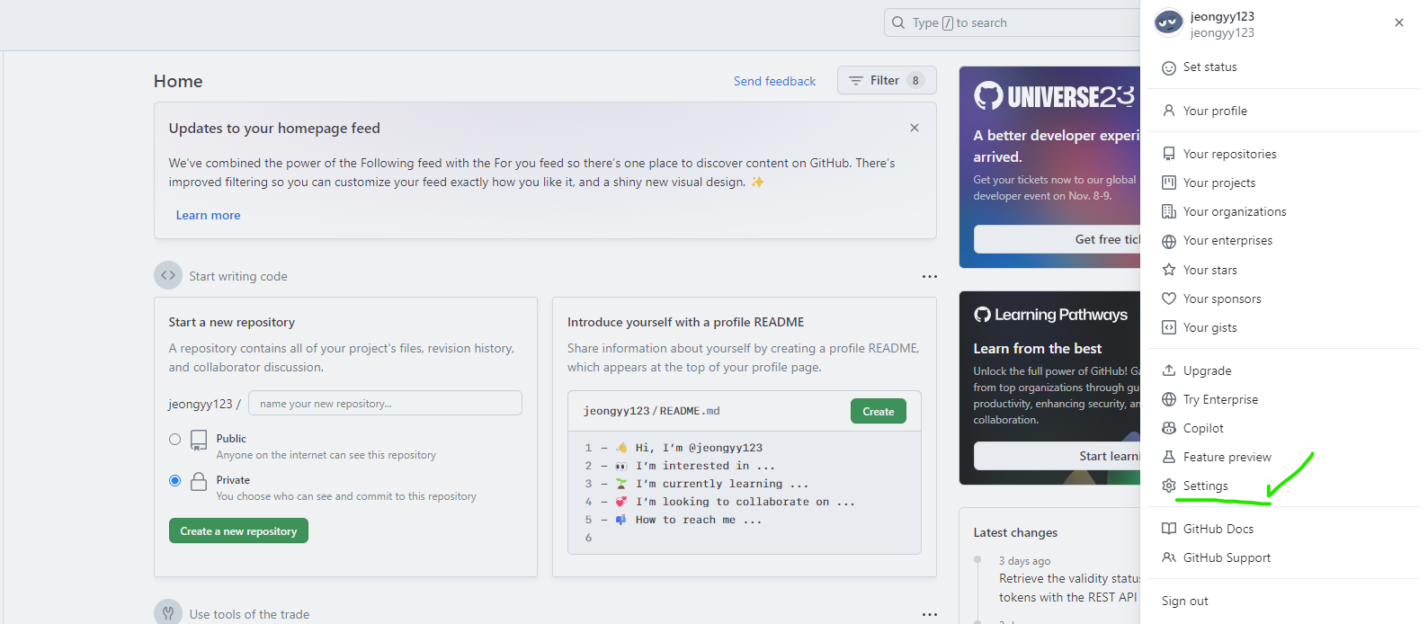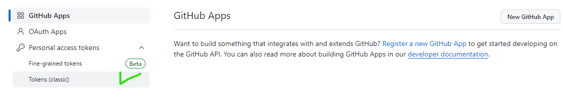 setting -> (맨 밑)Developer settings -> tokens(classic)으로 들어가 토큰을 받는다!