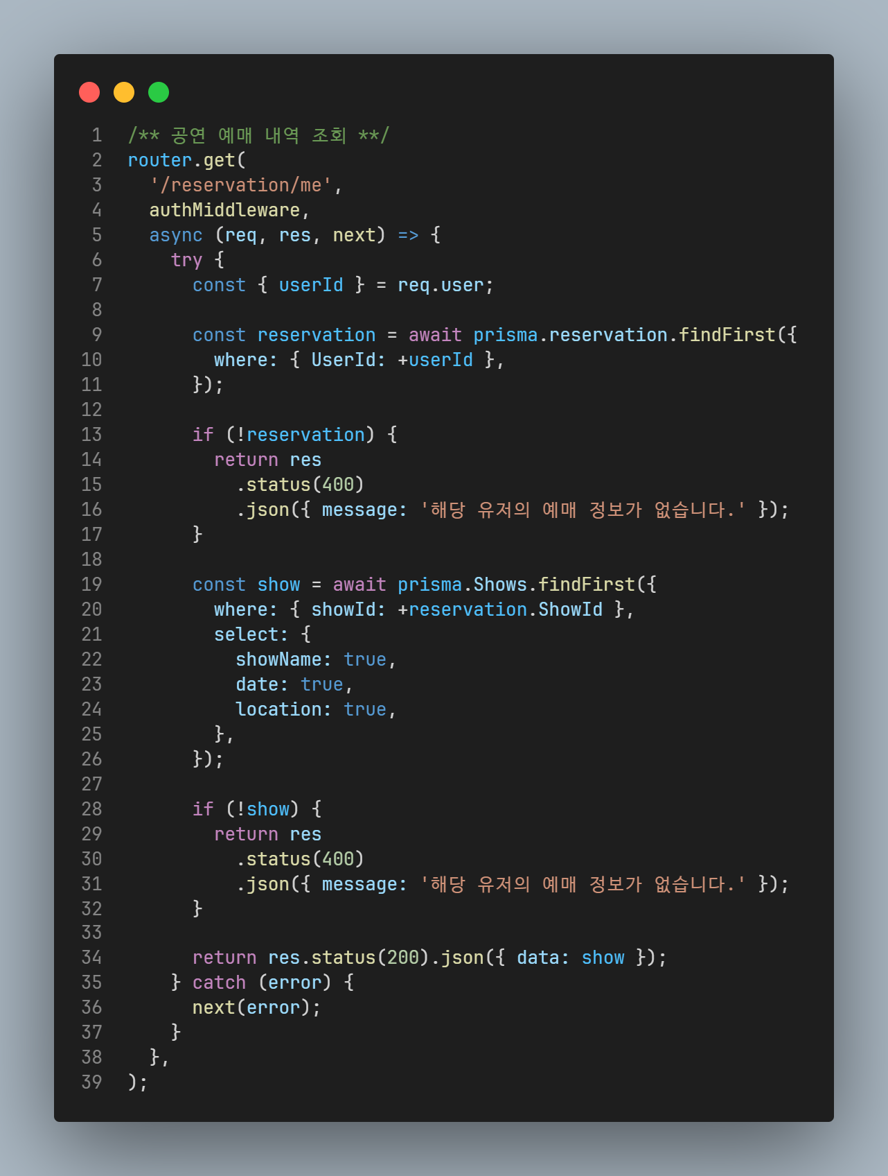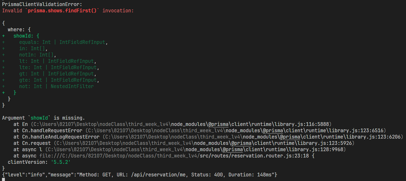 위의 코드는 authmiddleware에서 req.user를 가져와서 userId를 통해 예약정보를 찾고, 찾은 예약 정보에 들어있는 showId를 통해서 찾고 그걸 반환해주는 코드였다.