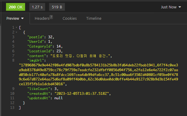 게시글을 작성할 때 사진 여러장을 업로드할 때를 대비하여 imgUrl을 배열형태로 보내줬어야했다.