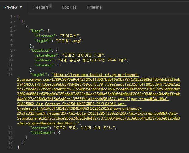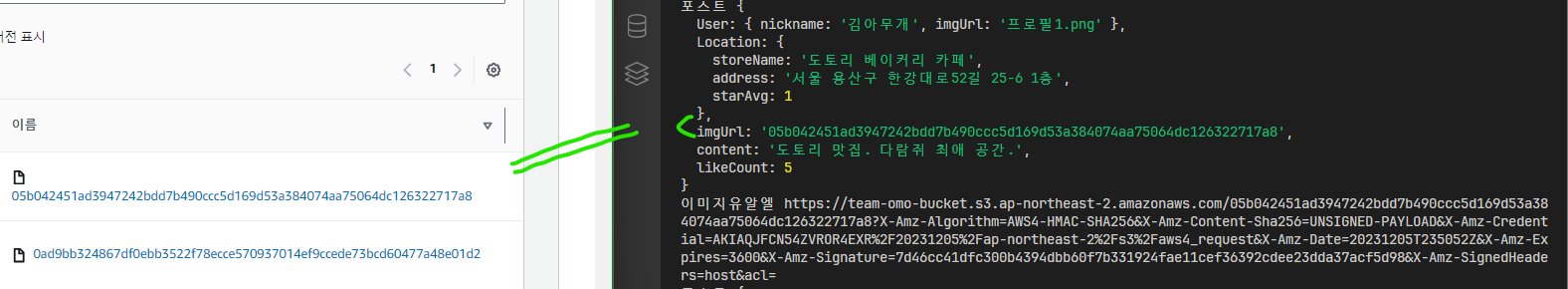 같은 내용, 같은 UserId로 다른 imgUrl 다섯개가 들어간걸 볼 수 있다.