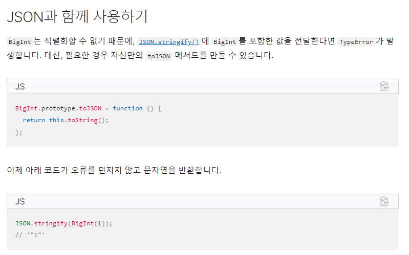 JSON.stringify()에 bigInt를 포함한 값을 전달하면 typeError가 발생한다고 한다.