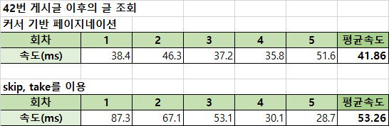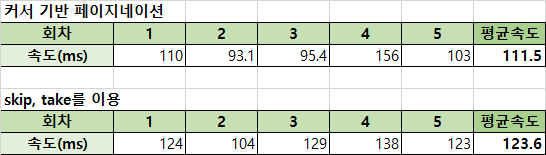 근소한 차이지만 확실히 커서 기반 페이지네이션 방법이 빠르긴 했다.