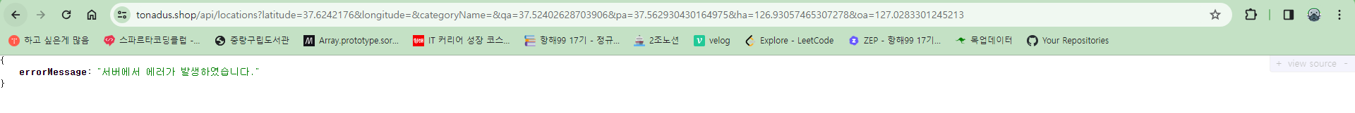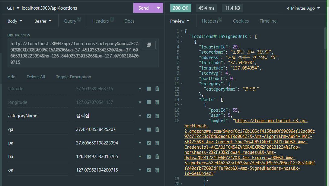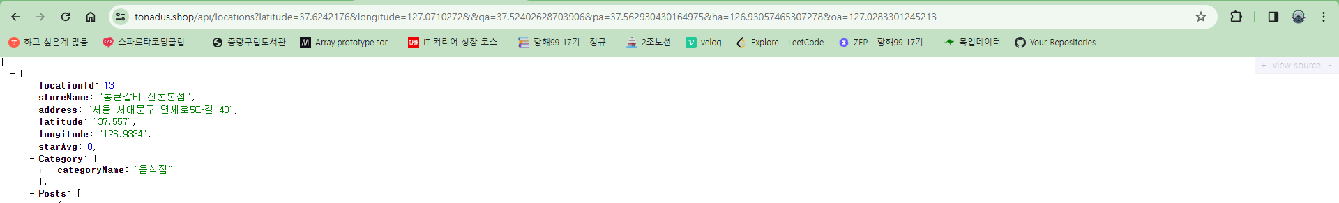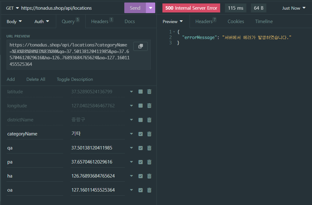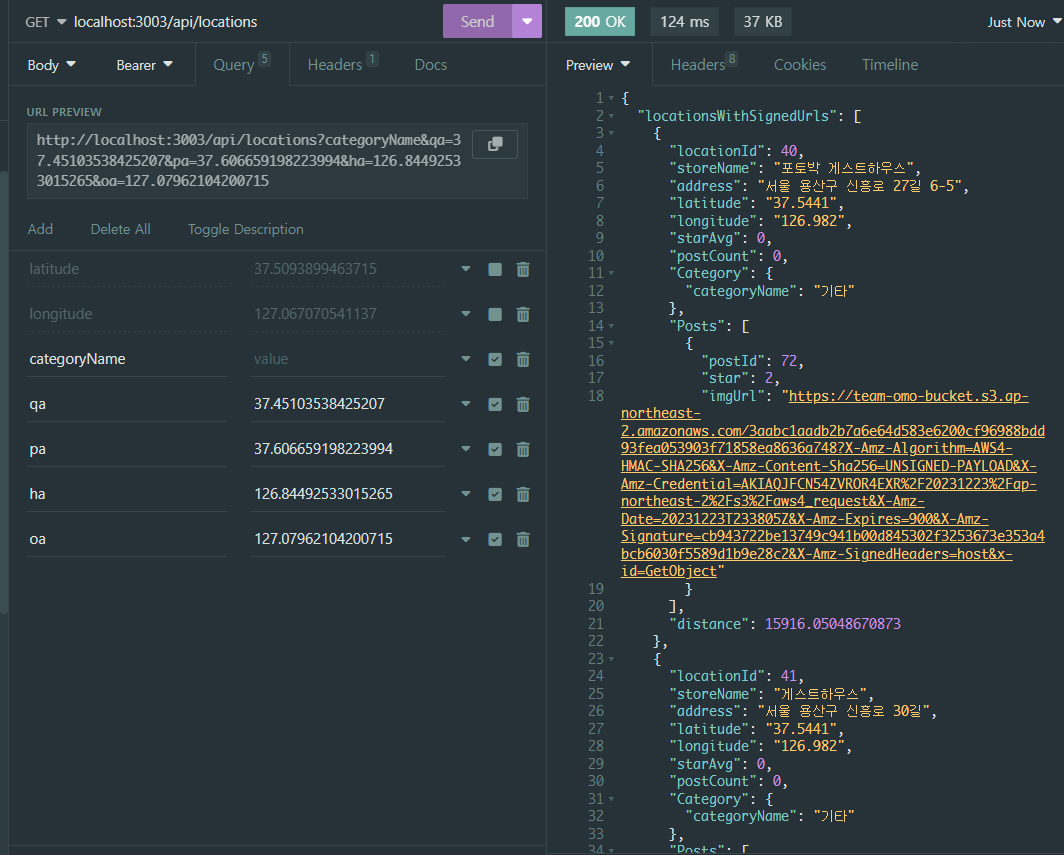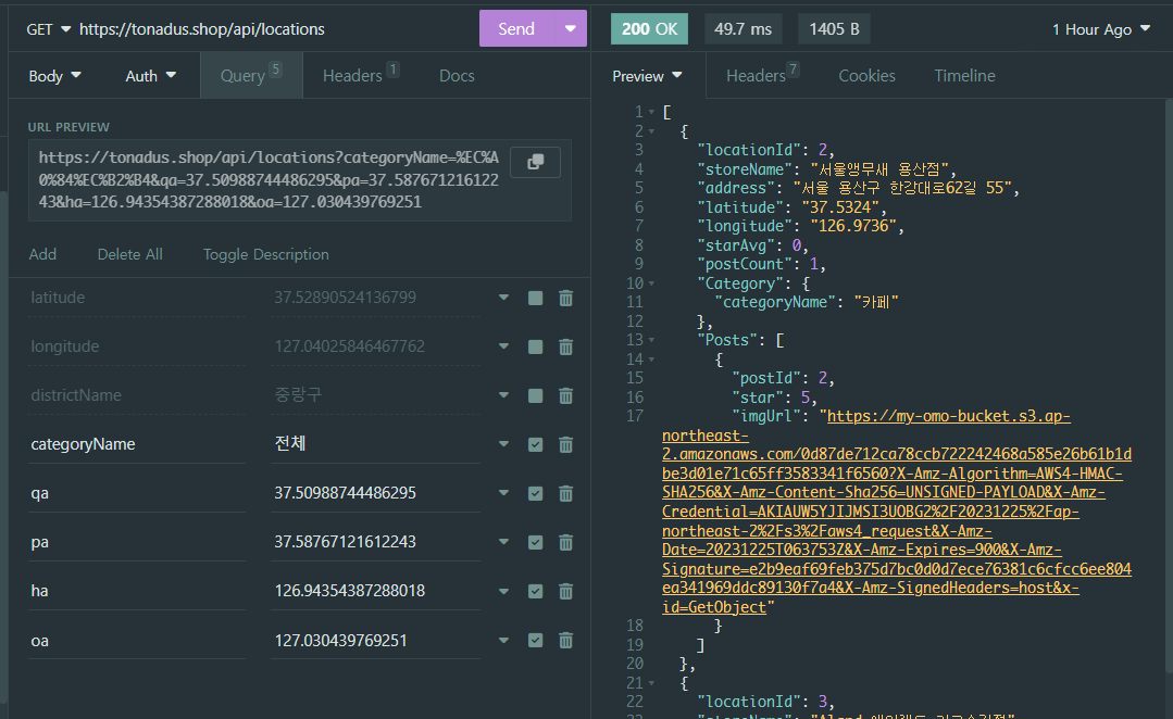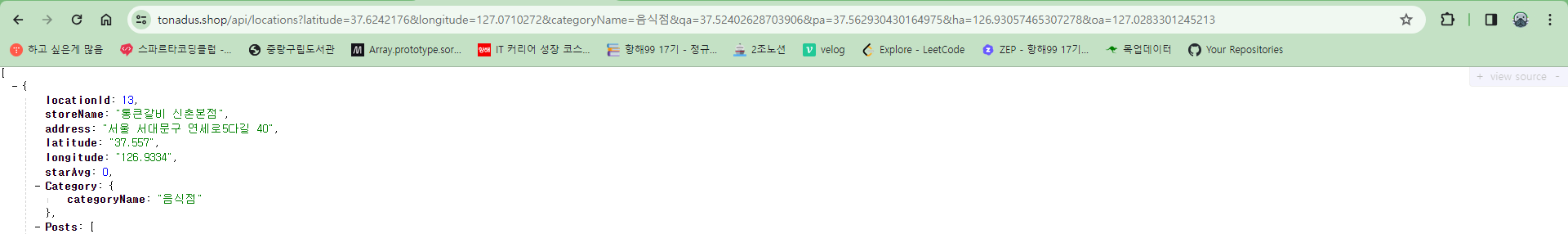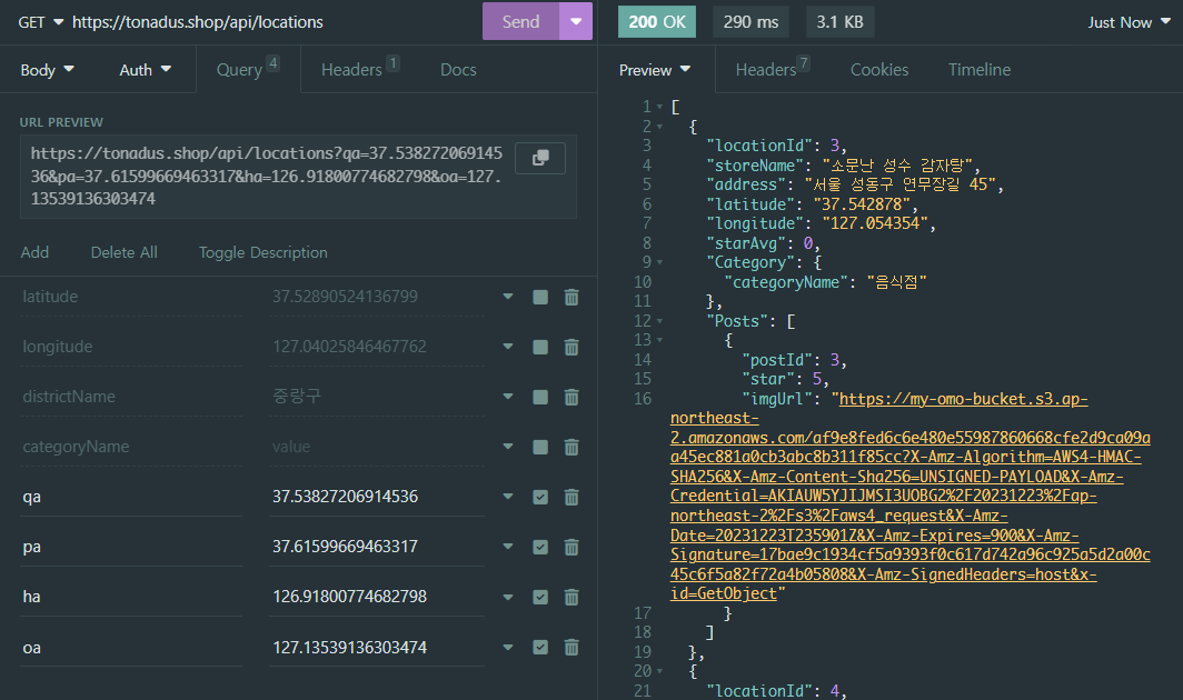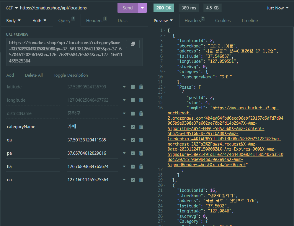 category는 categoryName으로 찾은 catagory내용이고, category의 categoryId를 통해서 location을 찾는 방식이었다. 간단하게 그냥 프론트에서 categoryId를 받아서 하면 간단하지 않냐고 생각할 수 도 있지만, DB의 내용을 삭제하는 일이 일어날 것을 대비해서 (categoryId(PK)를 autoincrement로 설정해놔서 변경되어버림) 그냥 고유값을 가진 categoryName으로 요청을 보내고 받기로했던 것이었다.