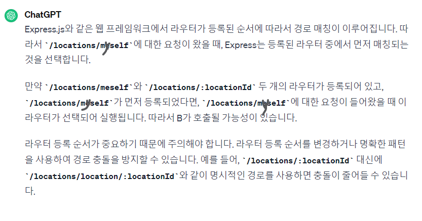 자꾸 A를 호출할 때 B가 호출되어 에러가 발생했던 적이 있었다. 그때 myself가 locaionId인 params로 들어가서 발생한 문제였다. 이때 중요한 건 라우터의 호출되는 순서였다. 아래는 chatGPT의 대답.
