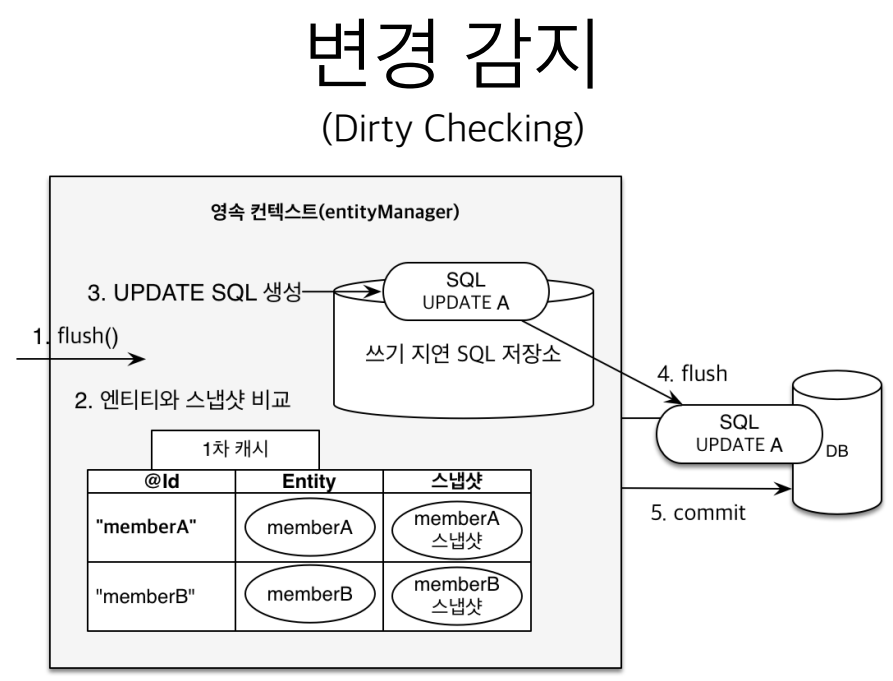 2) 엔티티와 스냅샷을 비교함. 1차 캐시 내에는 1차 캐시와 스냅샷(영속 컨텍스트에 들어온 당시의 값을 저장해둠)이 있음. 값을 변경하게 되면 flush()가 실행이 되고 변경된 내용과 스냅샷을 비교함.