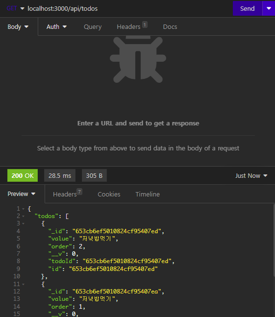 이렇게 저장하고, app.js를 실행해서 서버를 키고 insomnia에서 API가 잘굴러가는지 확인할 수 있다.