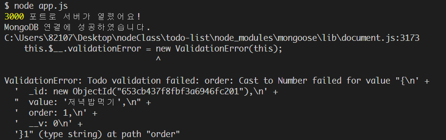 다 만들고나서 서버 실행 -> todo 내용을 Json으로 입력하고, 유효성검사가 잘 돌아가는지 확인하기 위해 같은거를 입력하려고 하자 아래와 오류가 나면서 서버가 멈췄다.