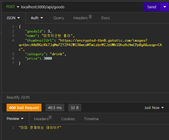 return res.status(400).json("이미 존재하는 데이터!")