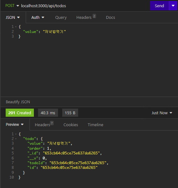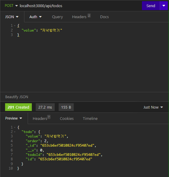 send를 누르면 이상이 없다면 아래와 같이 201 created와 함께 입력된 값들이 나온다.