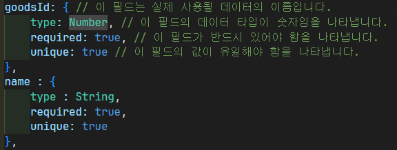 goodsSchema입니다.- 요구사항 구현이 완료되었으면, 해당하는 스키마를 ‘Goods’ 이름을 가진