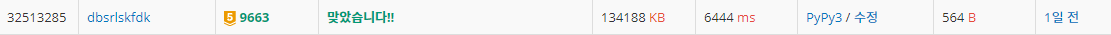 아, 그리고 참 python3 로 제출하면 시간 초과 난다.