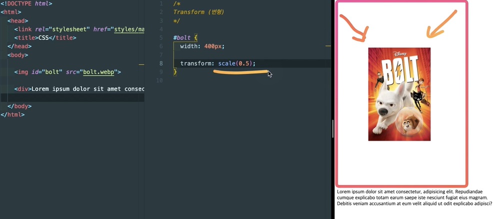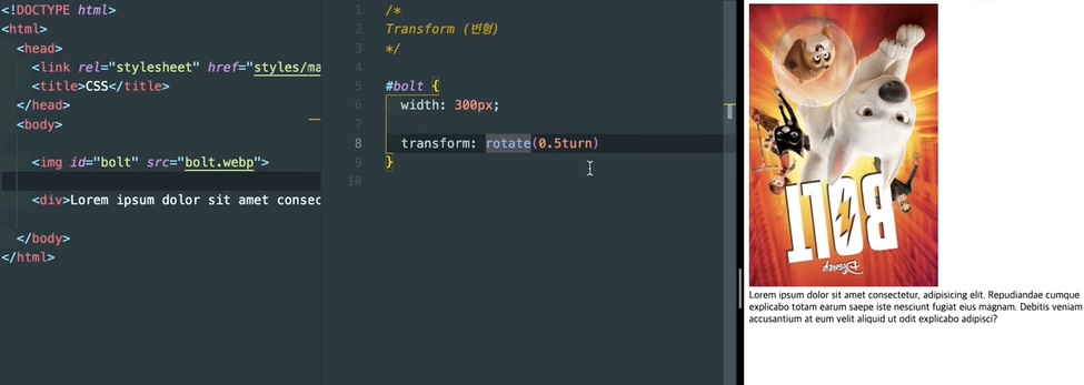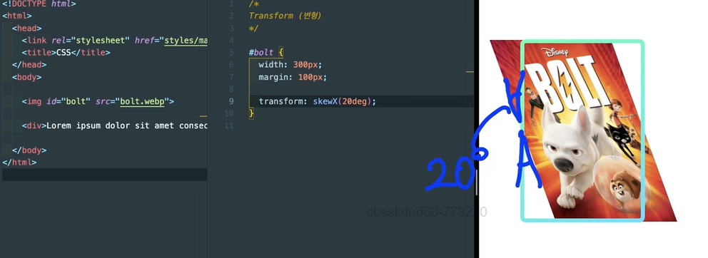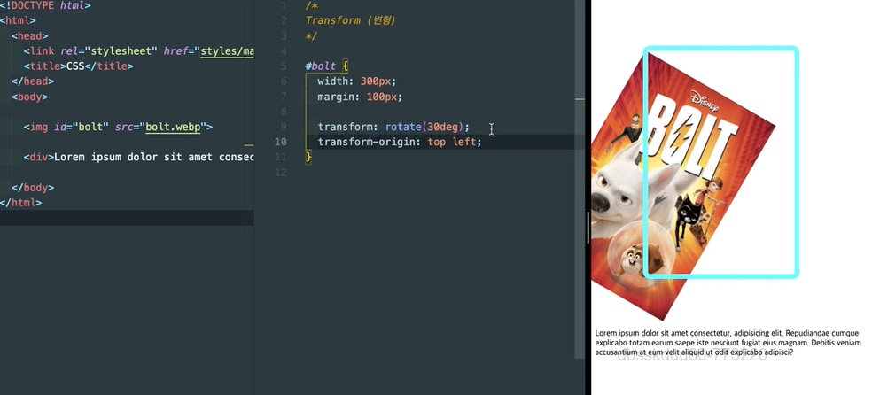 transform속성으로 요소에 회전, 크기 조절, 기울이기, 이동 효과를 부여할 수 있다.