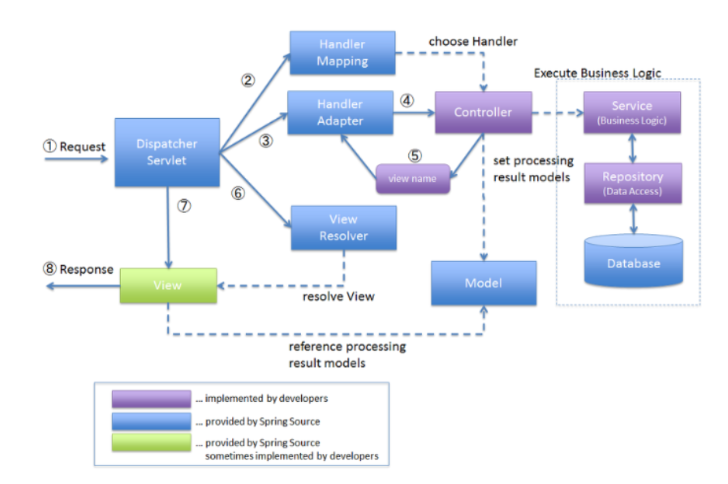 ① 클라이언트가 request -> 프론트 컨트롤러 역할의 dispatcher servlet은 그 요청을 처리하기 위한 컨트롤러 객체를 검색
