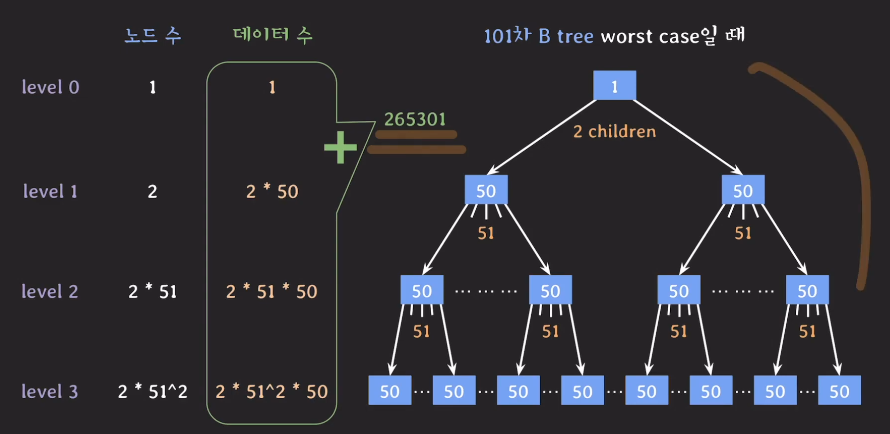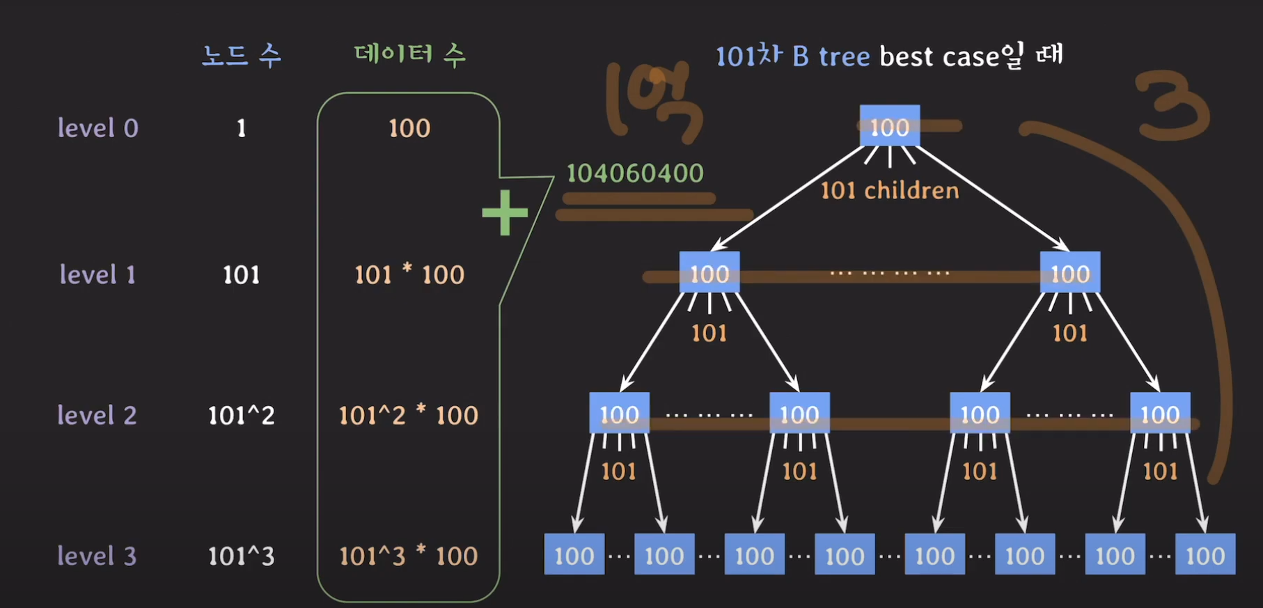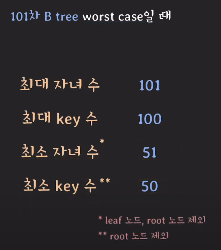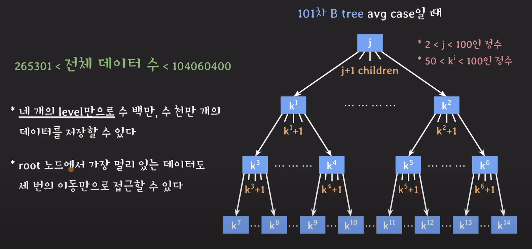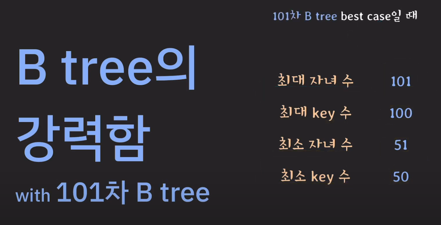 101차 B tree의 경우 높이가 3밖에 되지 않는데 1억개의 데이터를 저장할 수 있게 됩니다!