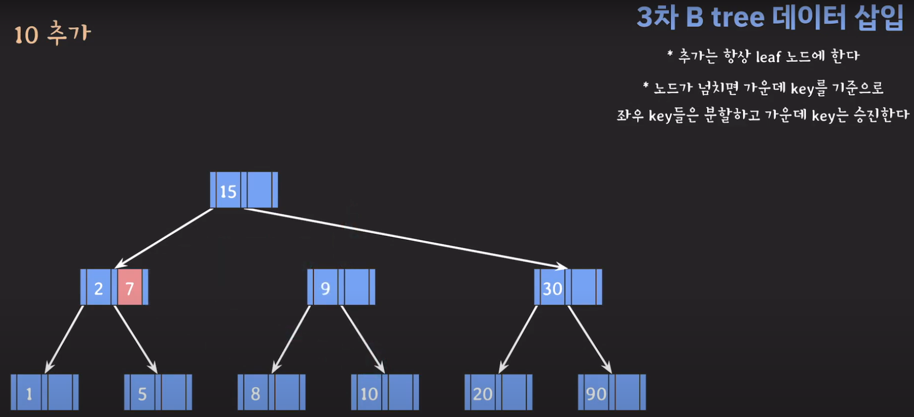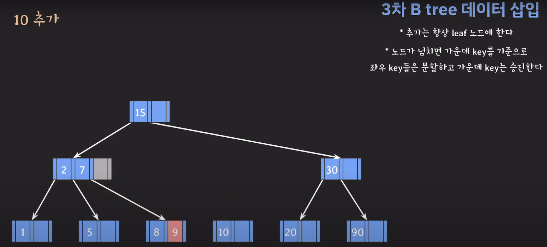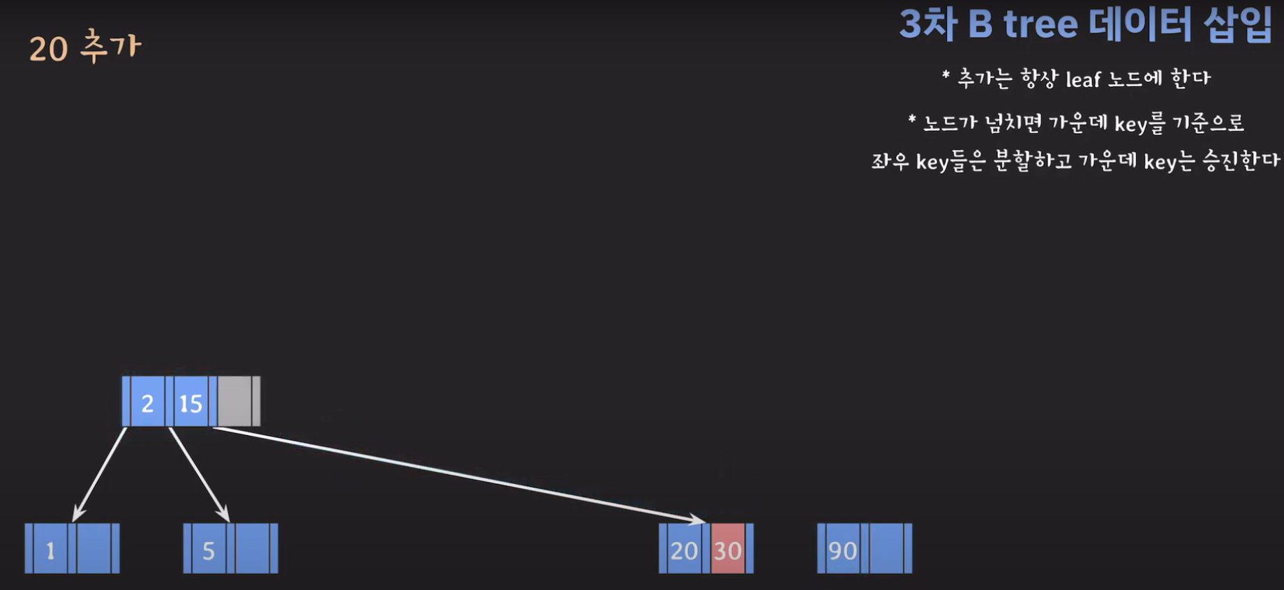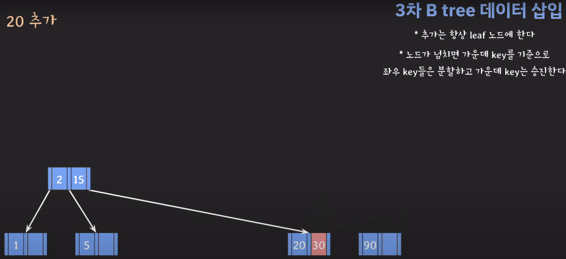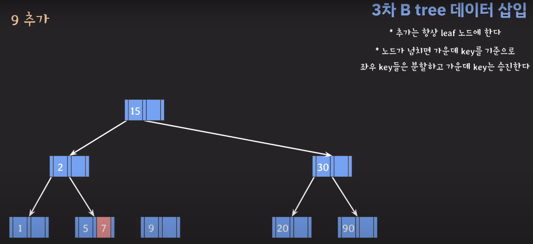 여기서 노드가 넘친다는 뜻은 각 노드의 최대 자녀수를 M이라고 정했을 때 각 노드의 key값이 M-1개를 넘어가는 경우를 말합니다.