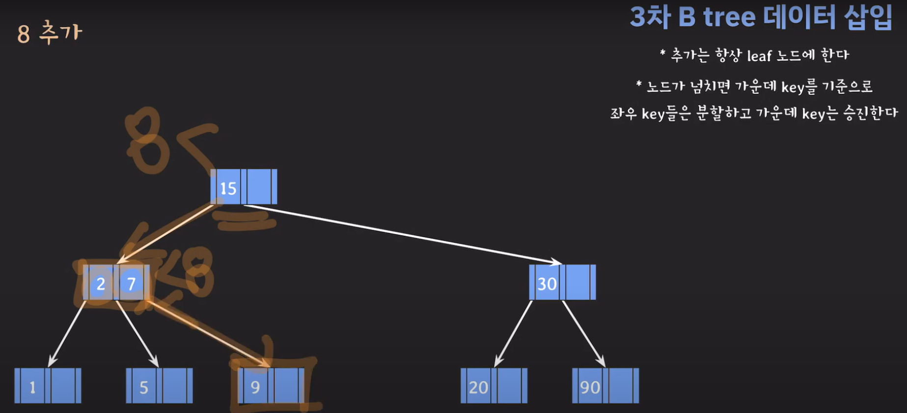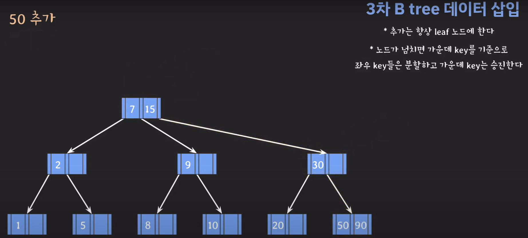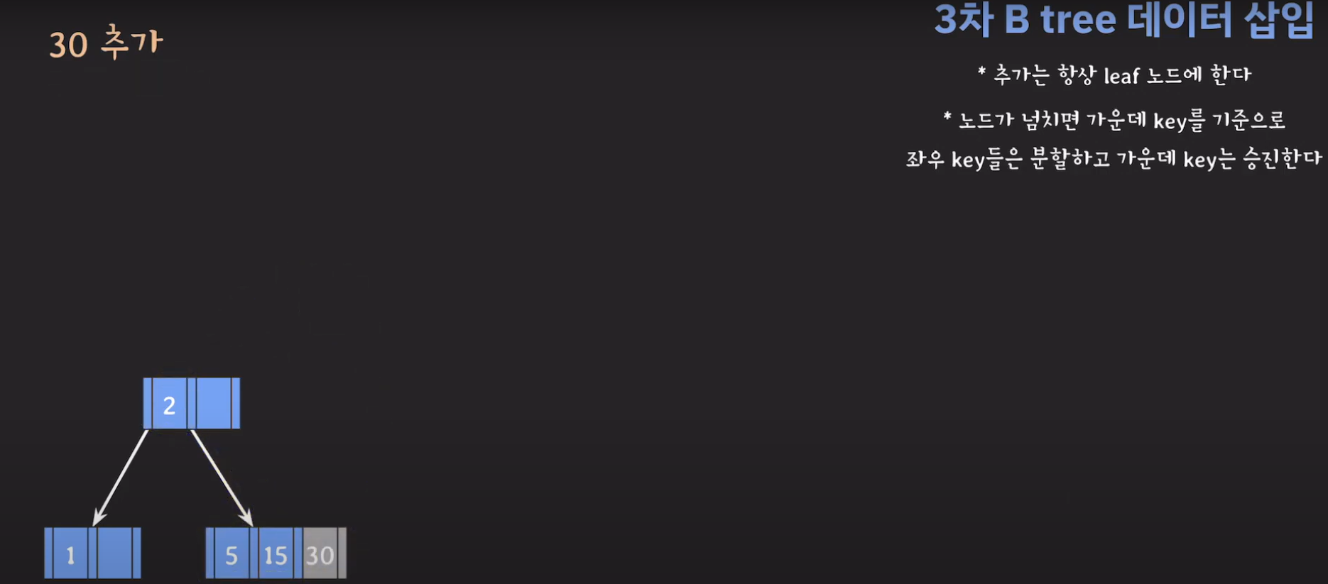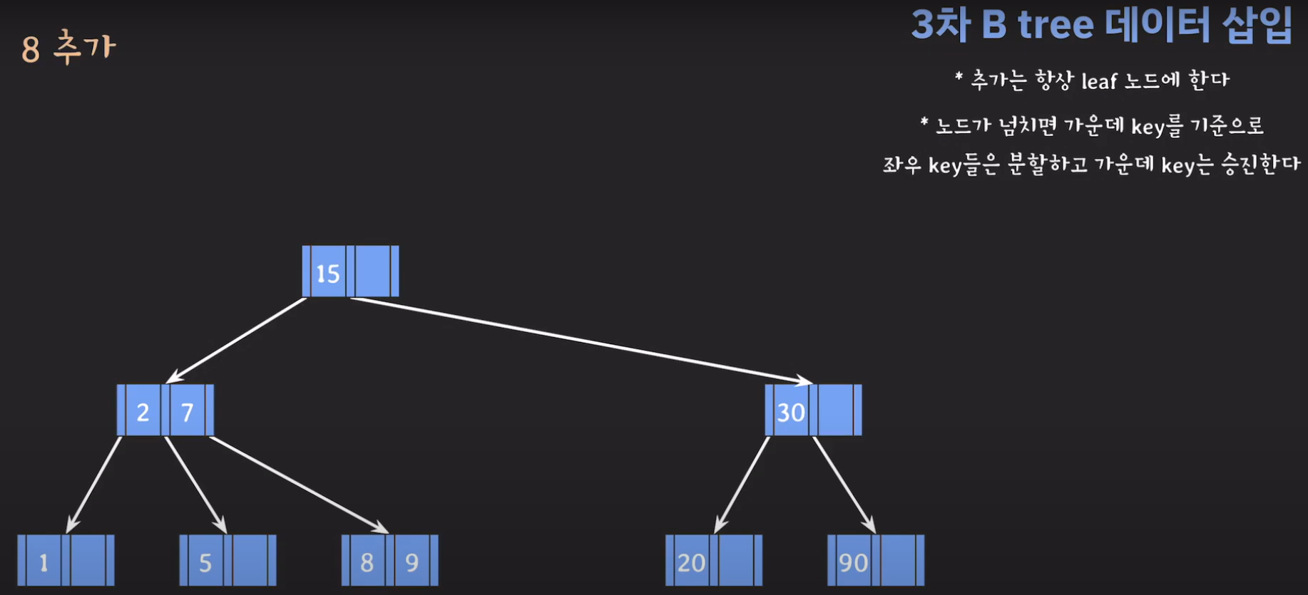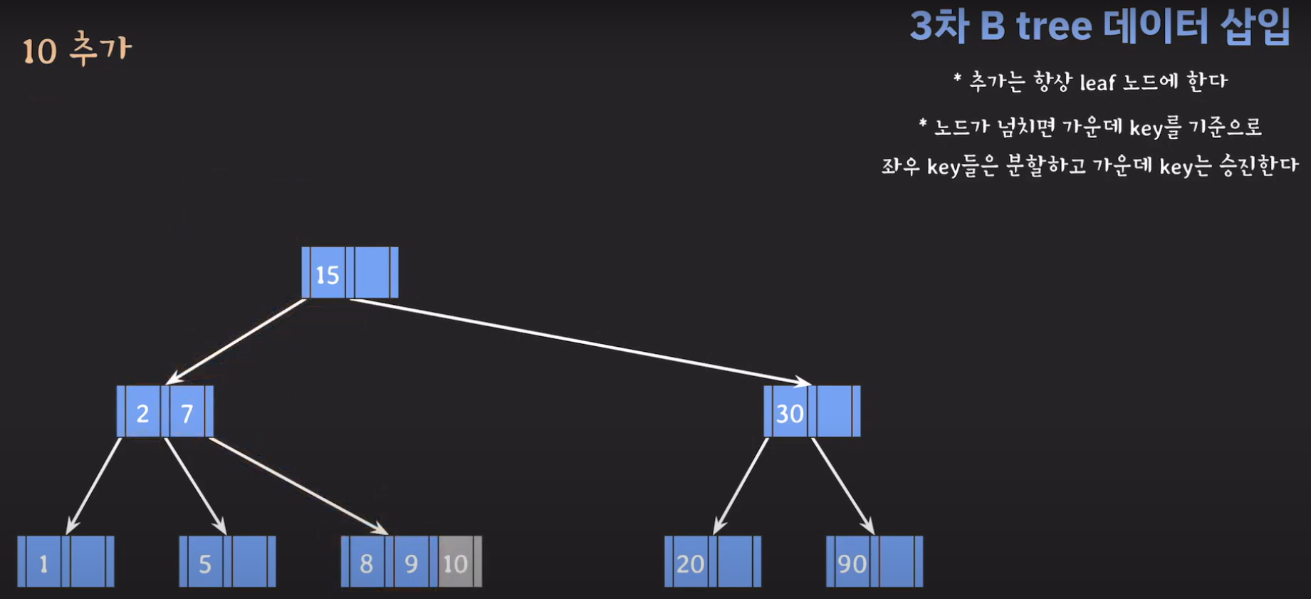 여기서 노드가 넘친다는 뜻은 각 노드의 최대 자녀수를 M이라고 정했을 때 각 노드의 key값이 M-1개를 넘어가는 경우를 말합니다.