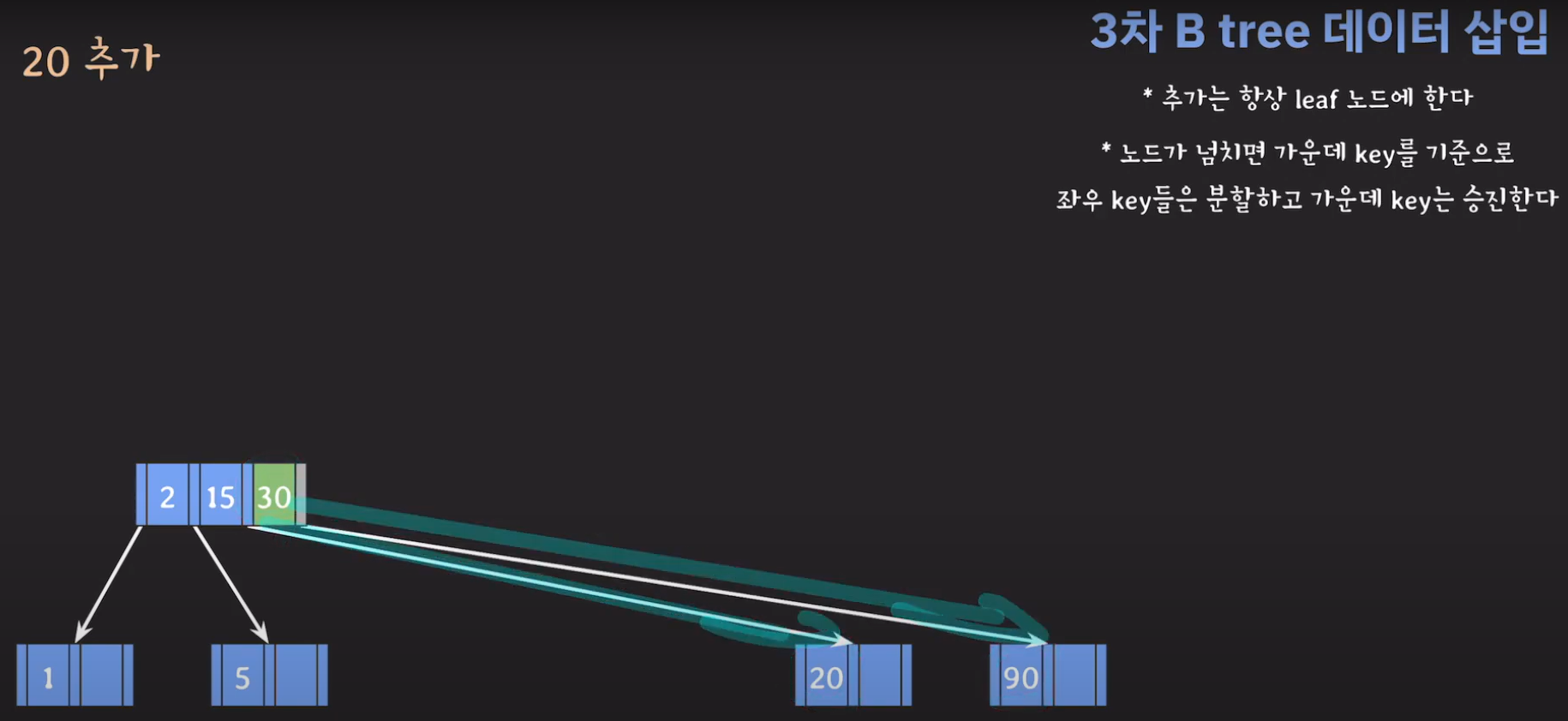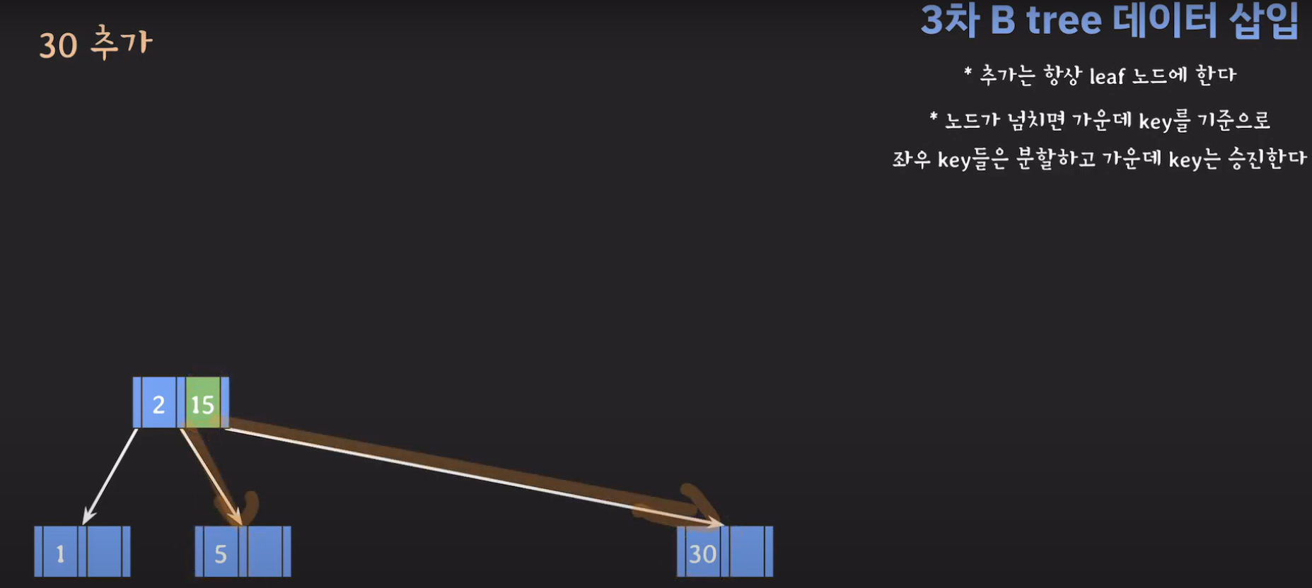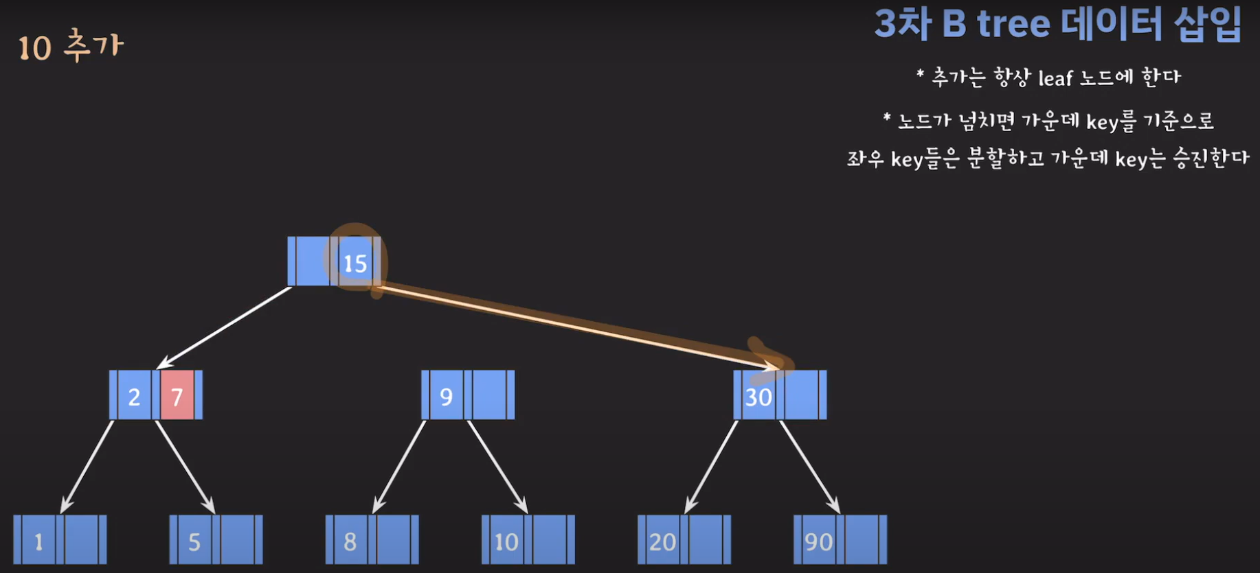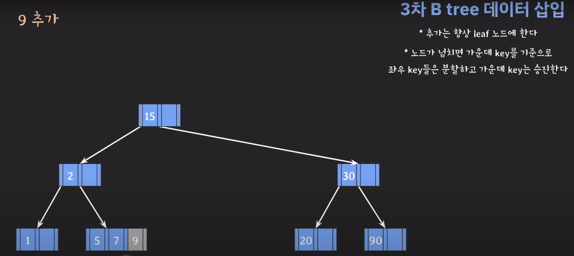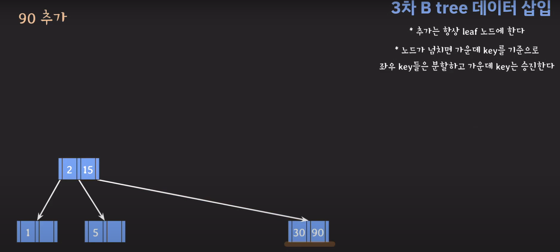 여기서 노드가 넘친다는 뜻은 각 노드의 최대 자녀수를 M이라고 정했을 때 각 노드의 key값이 M-1개를 넘어가는 경우를 말합니다.