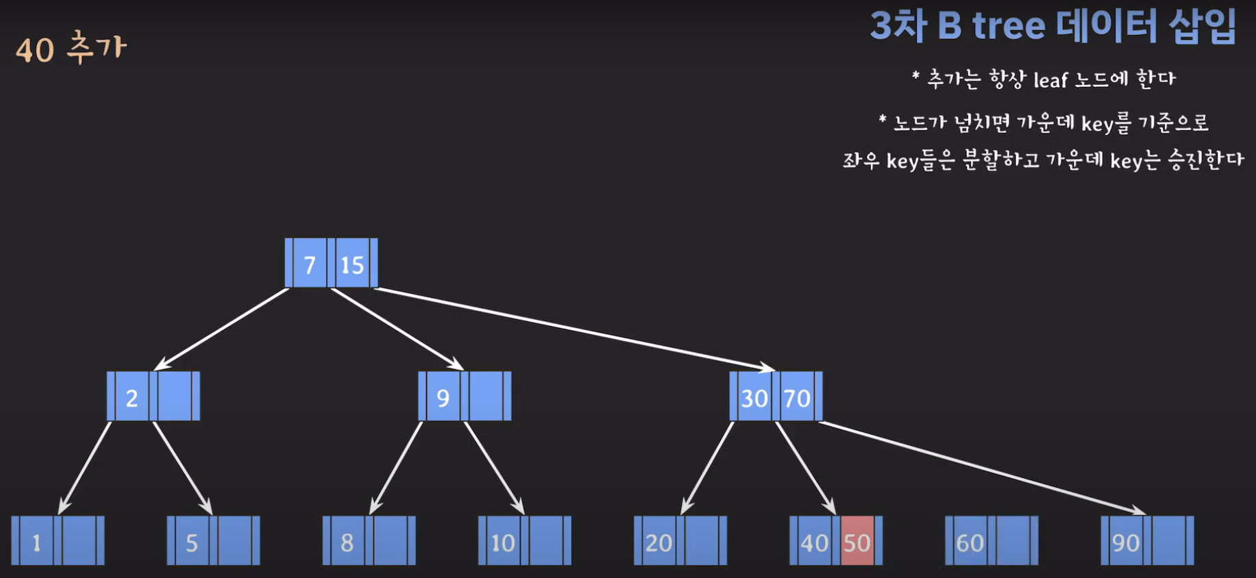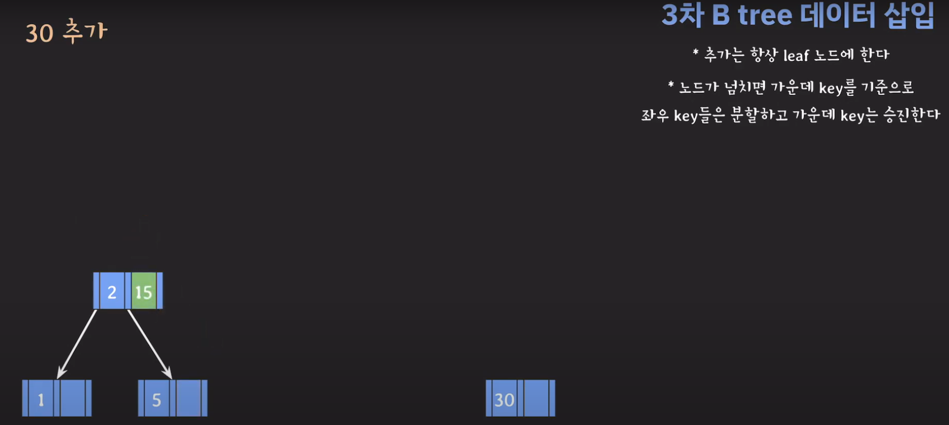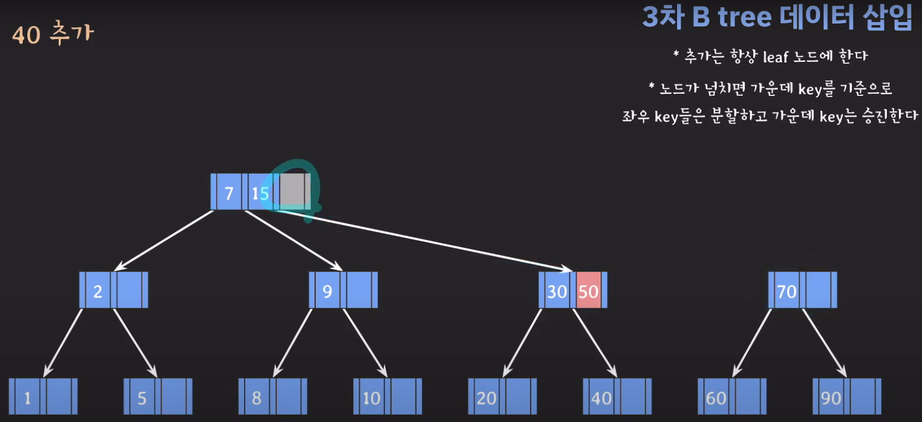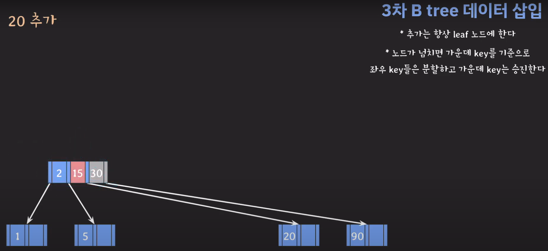 여기서 노드가 넘친다는 뜻은 각 노드의 최대 자녀수를 M이라고 정했을 때 각 노드의 key값이 M-1개를 넘어가는 경우를 말합니다.