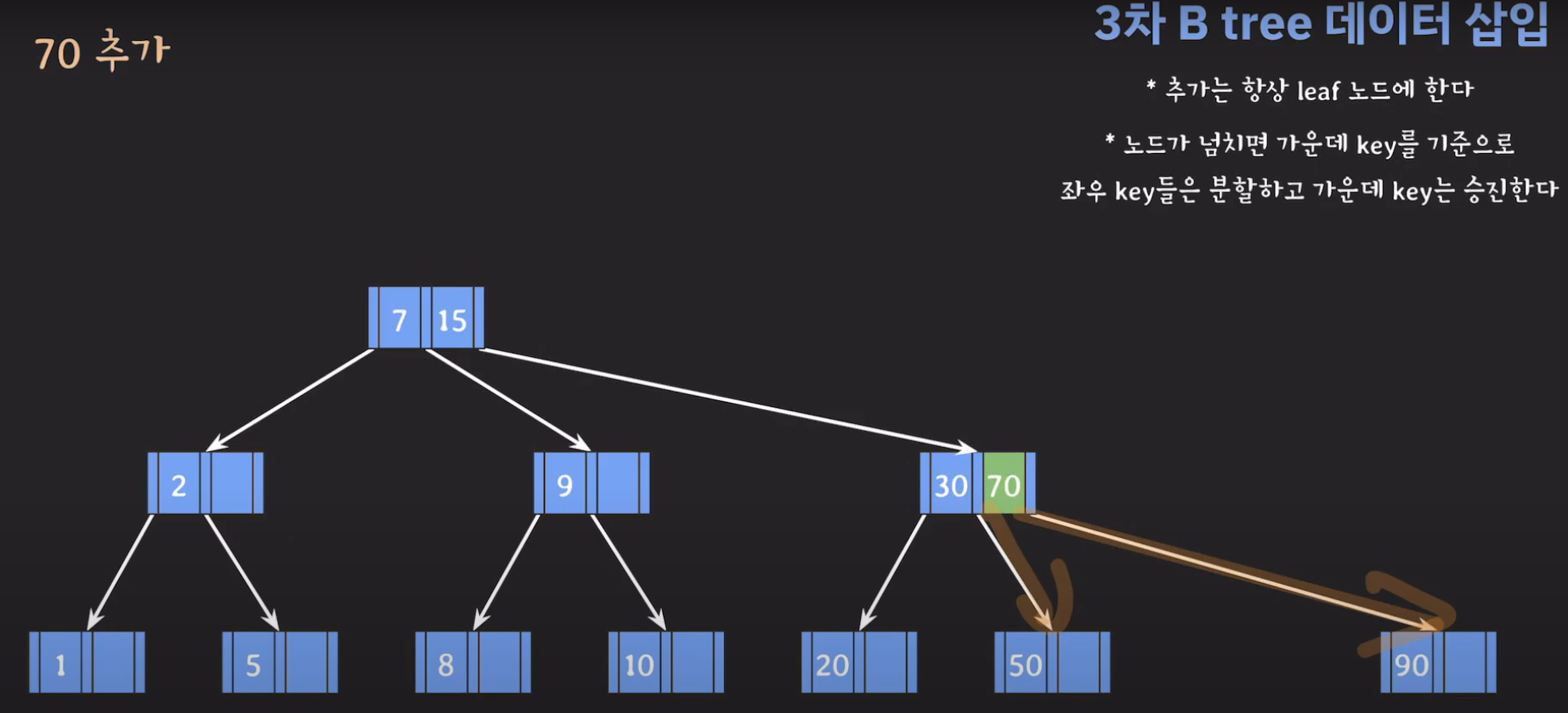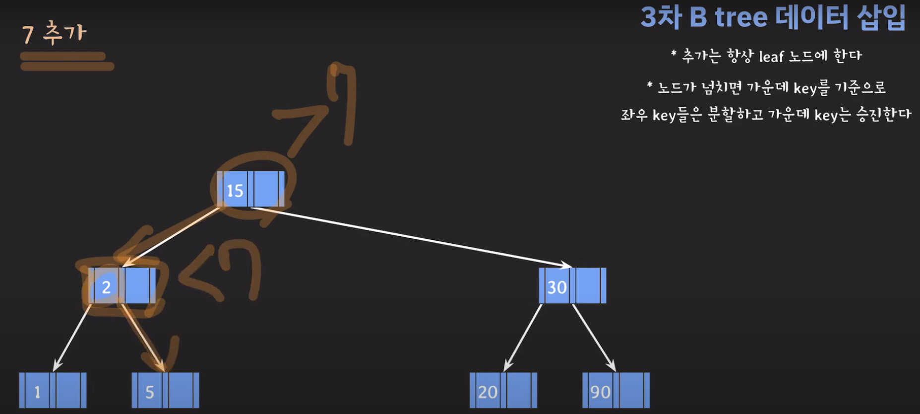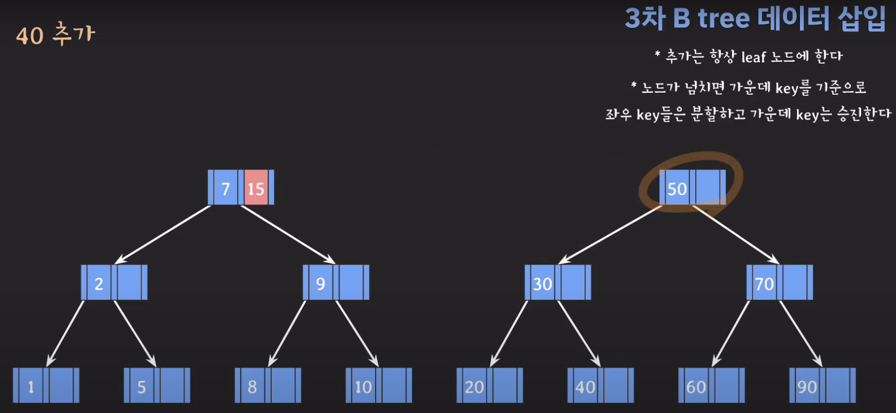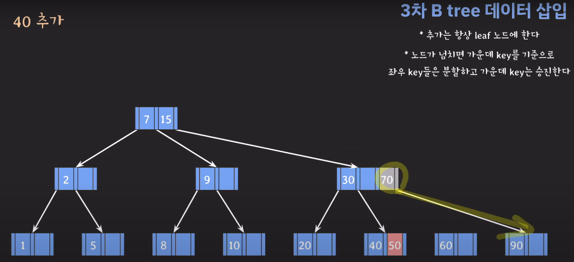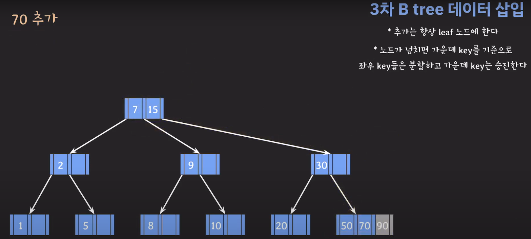 여기서 노드가 넘친다는 뜻은 각 노드의 최대 자녀수를 M이라고 정했을 때 각 노드의 key값이 M-1개를 넘어가는 경우를 말합니다.