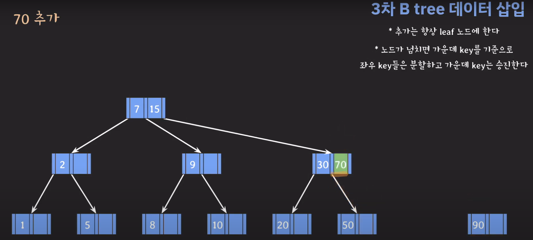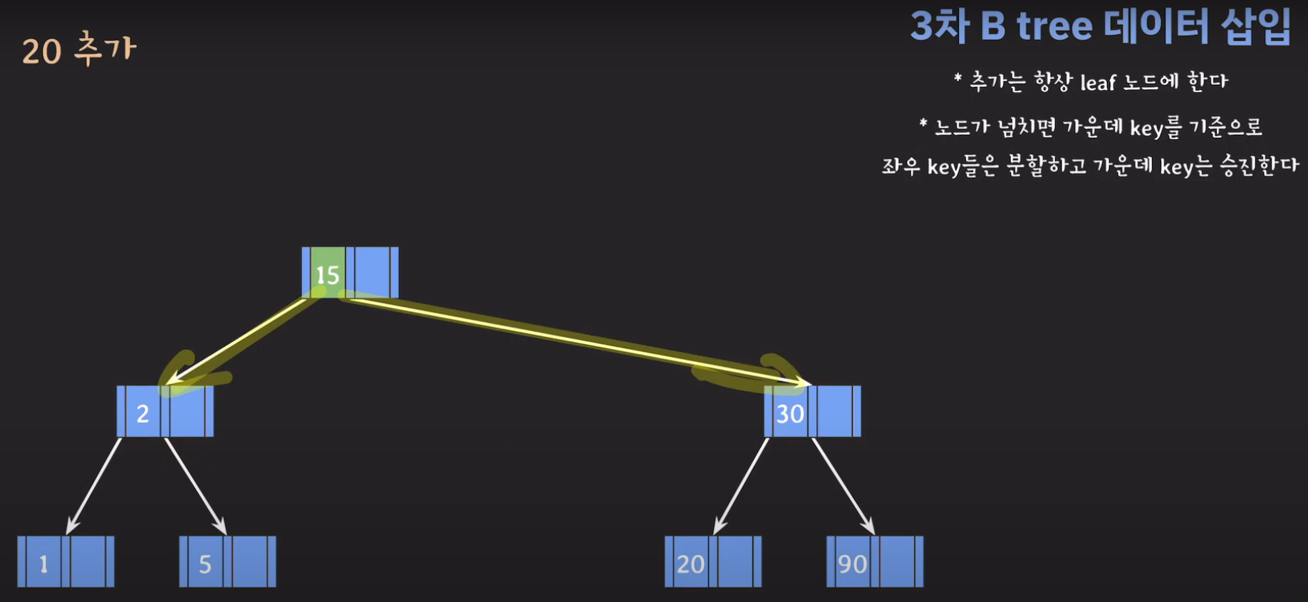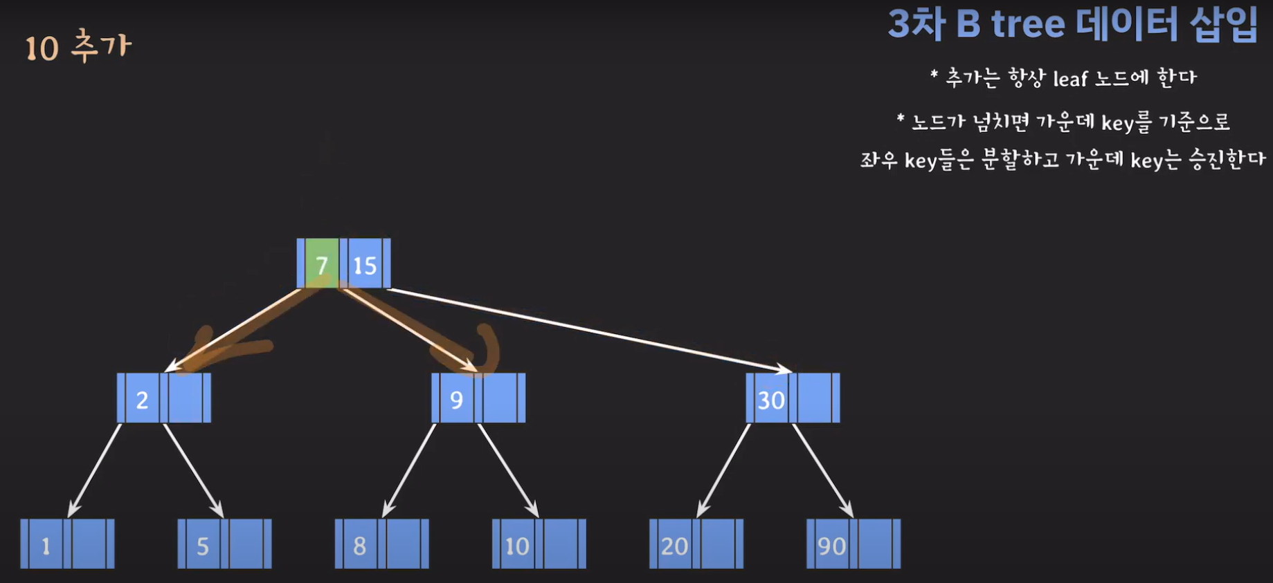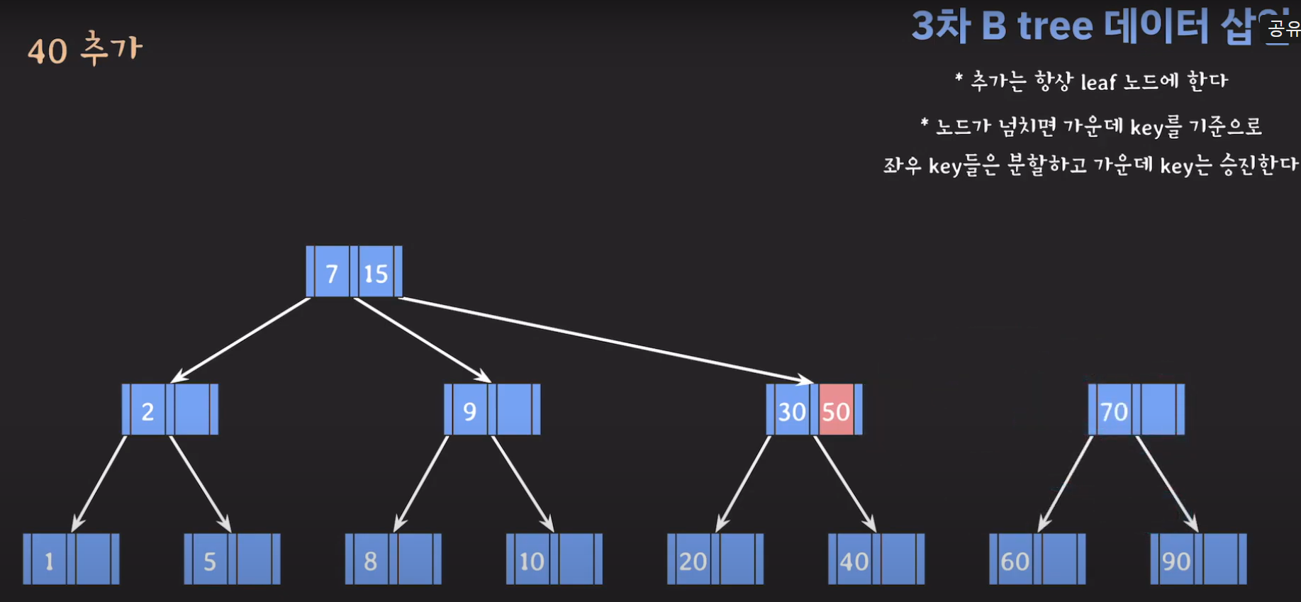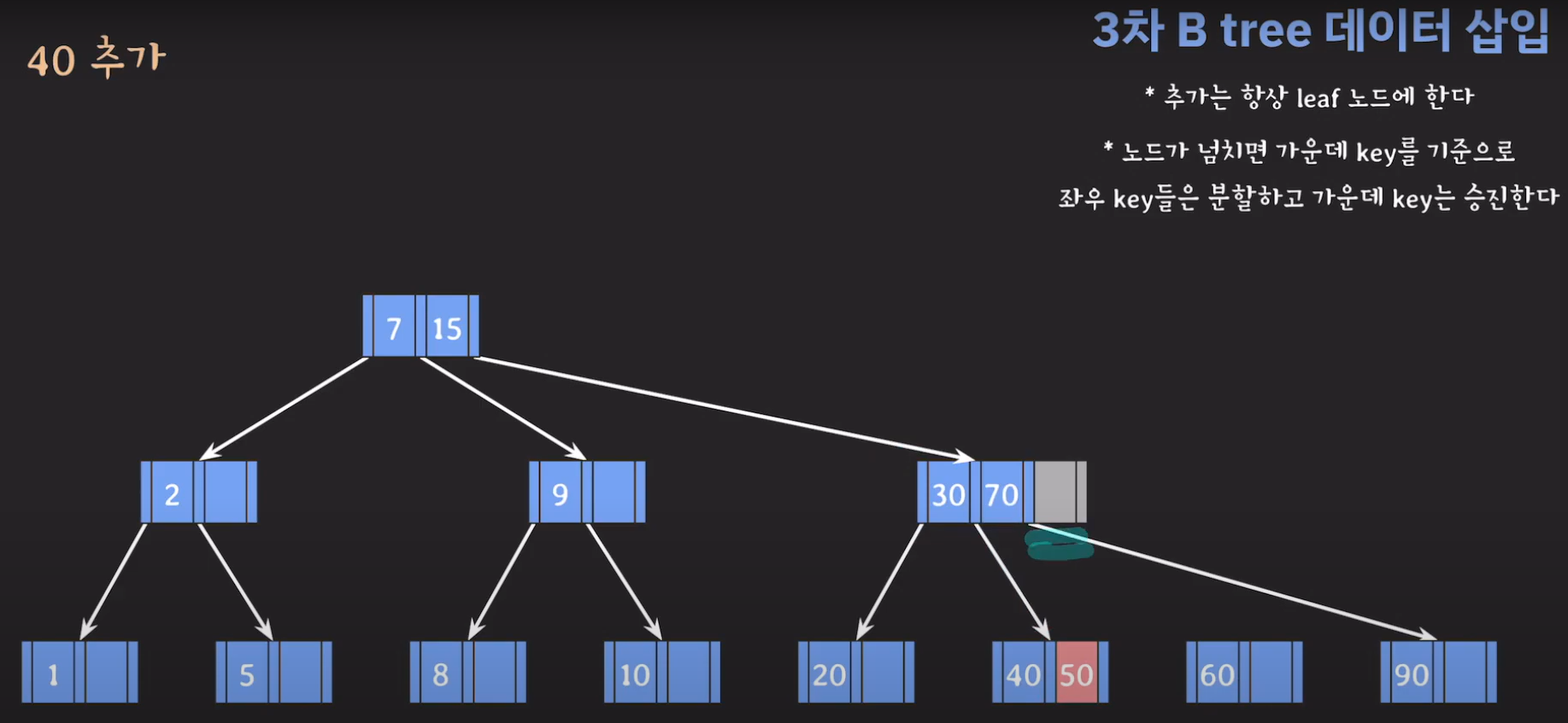 여기서 노드가 넘친다는 뜻은 각 노드의 최대 자녀수를 M이라고 정했을 때 각 노드의 key값이 M-1개를 넘어가는 경우를 말합니다.