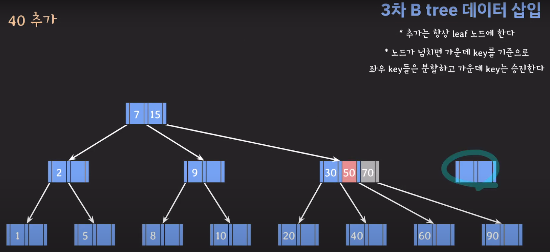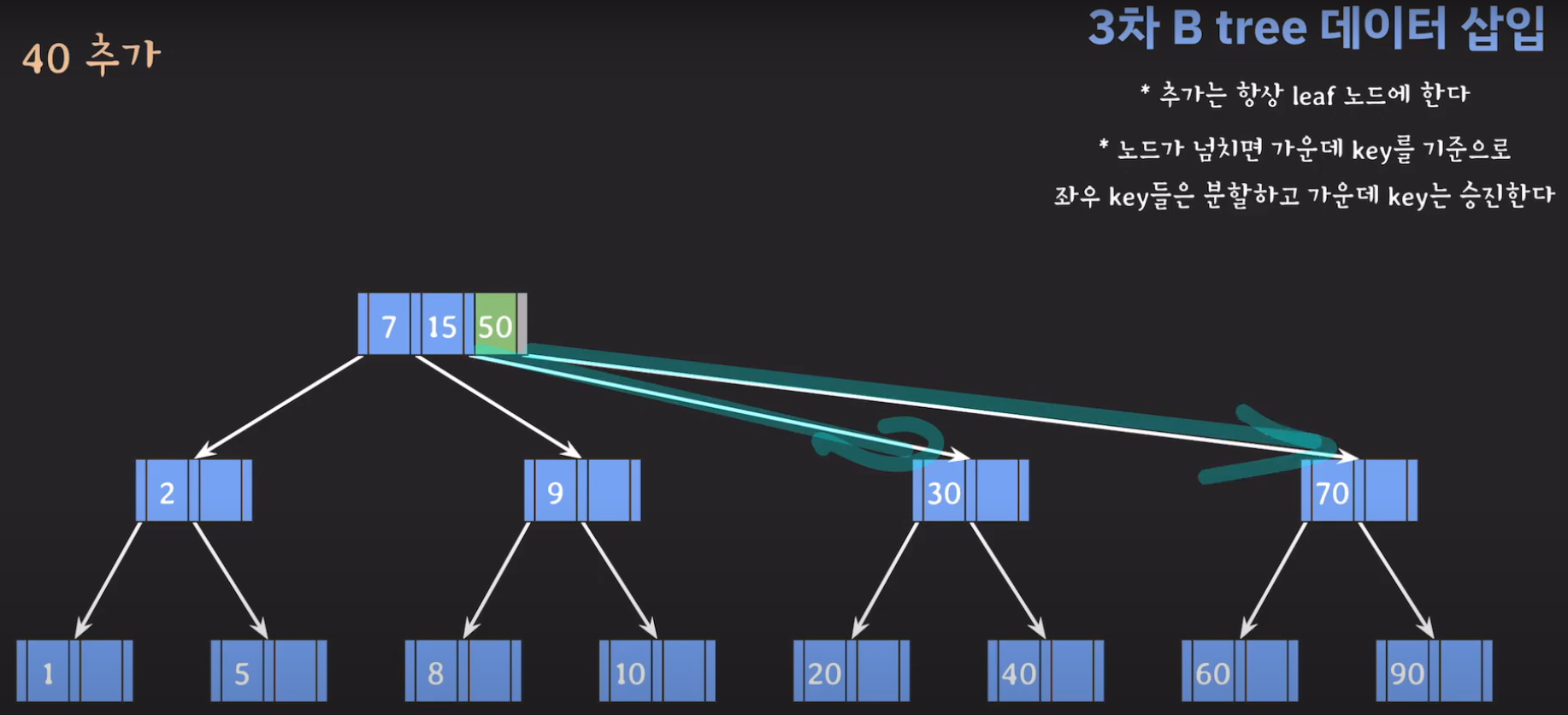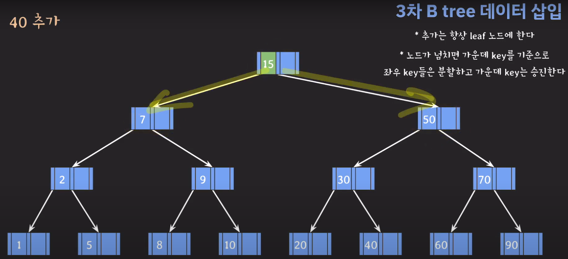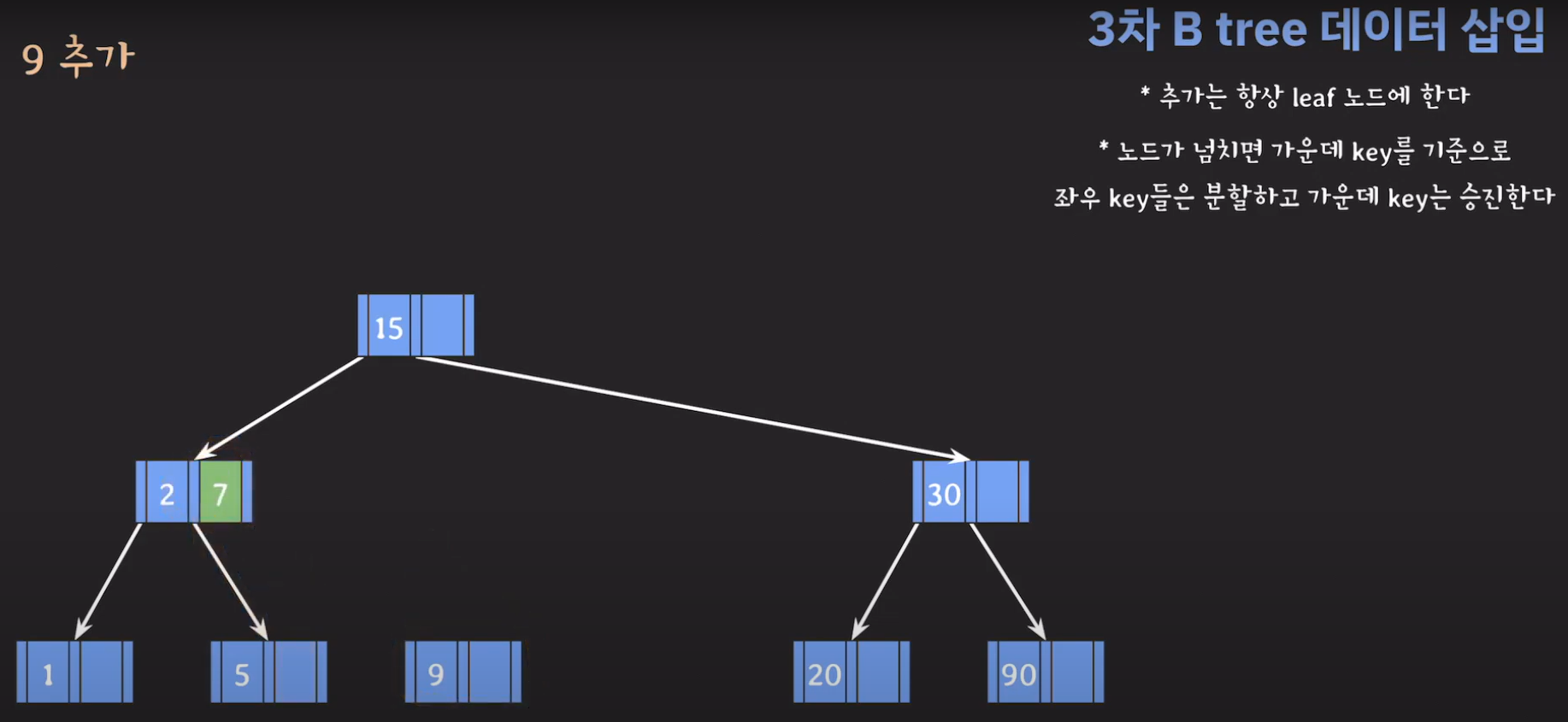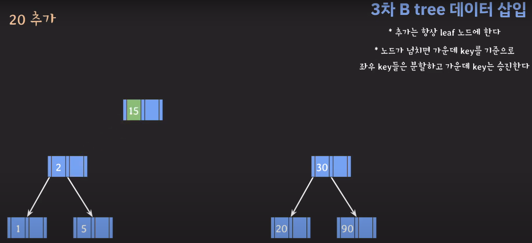 여기서 노드가 넘친다는 뜻은 각 노드의 최대 자녀수를 M이라고 정했을 때 각 노드의 key값이 M-1개를 넘어가는 경우를 말합니다.