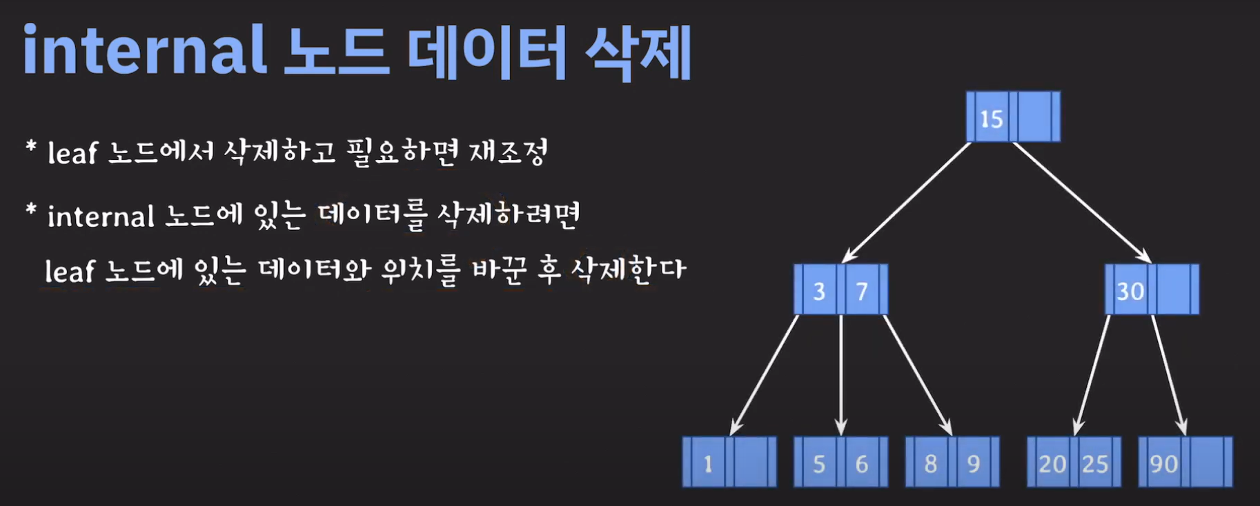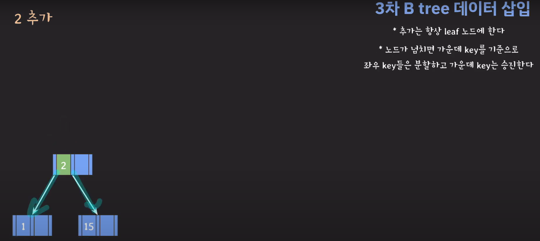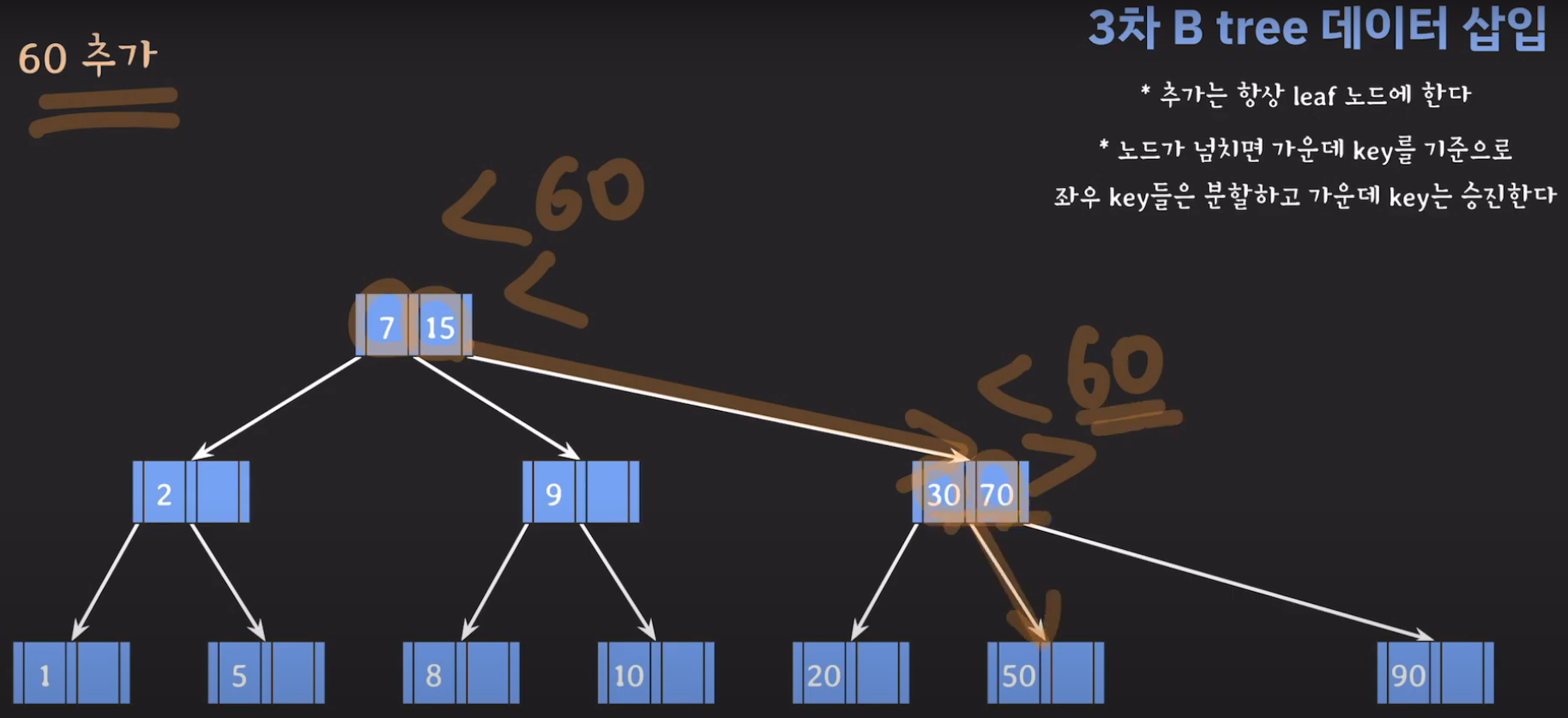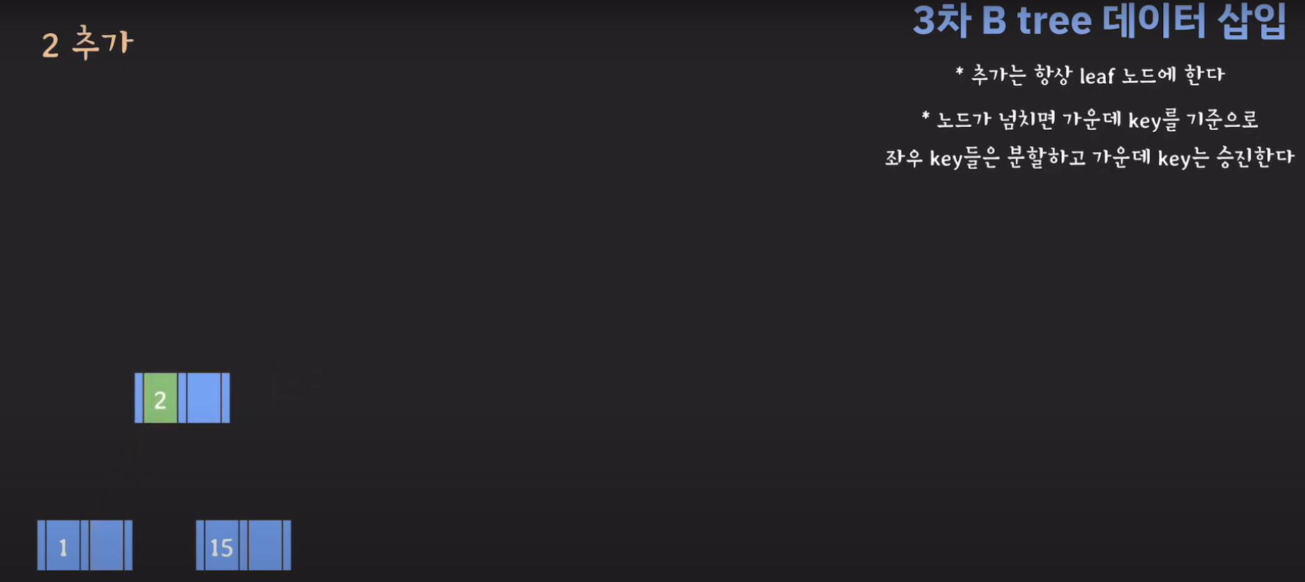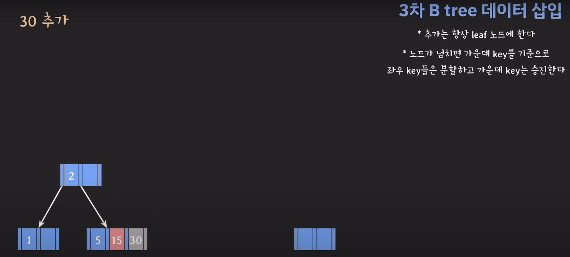 여기서 노드가 넘친다는 뜻은 각 노드의 최대 자녀수를 M이라고 정했을 때 각 노드의 key값이 M-1개를 넘어가는 경우를 말합니다.
