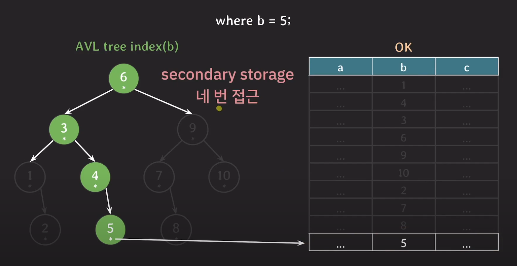 마지막으로 5가 실제로 가리키고 있는 데이터들 모두 Secondary Storage에서 읽어와야 합니다.