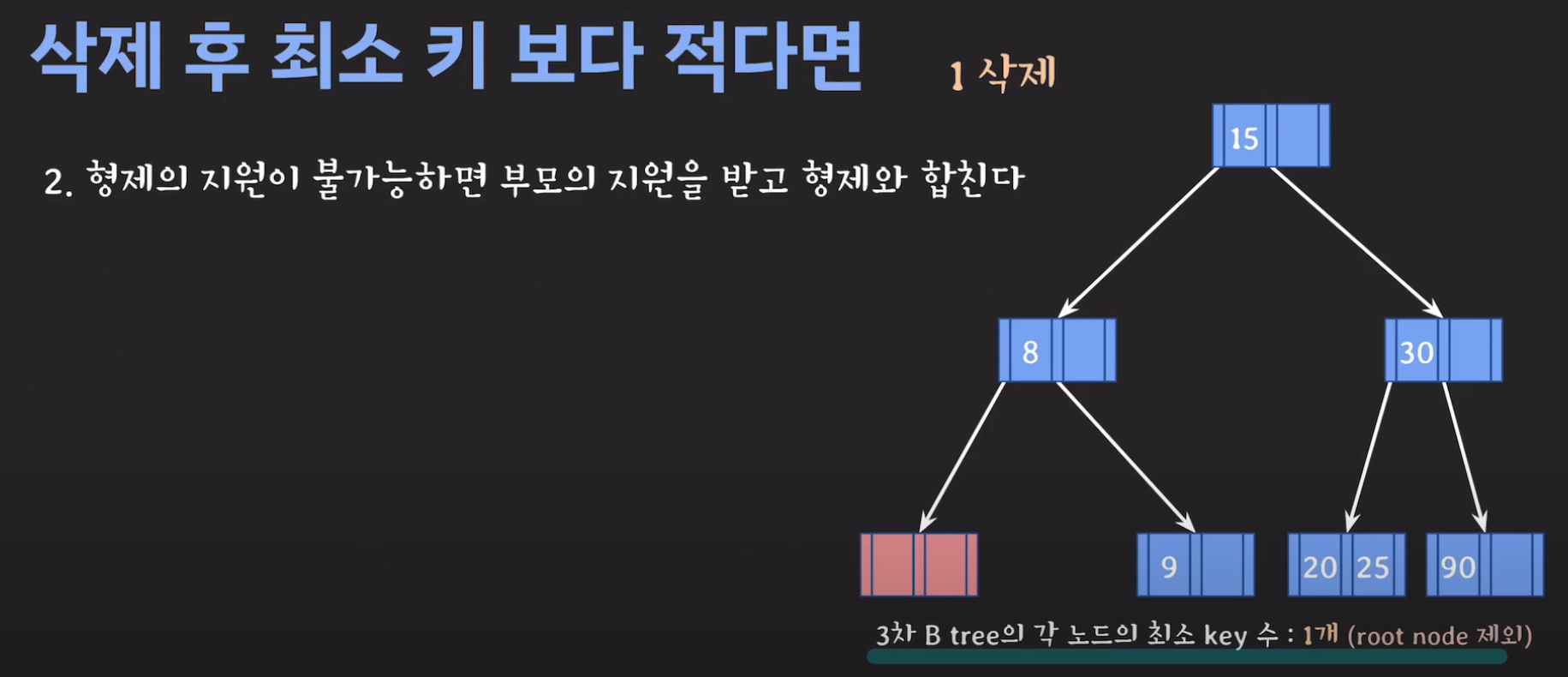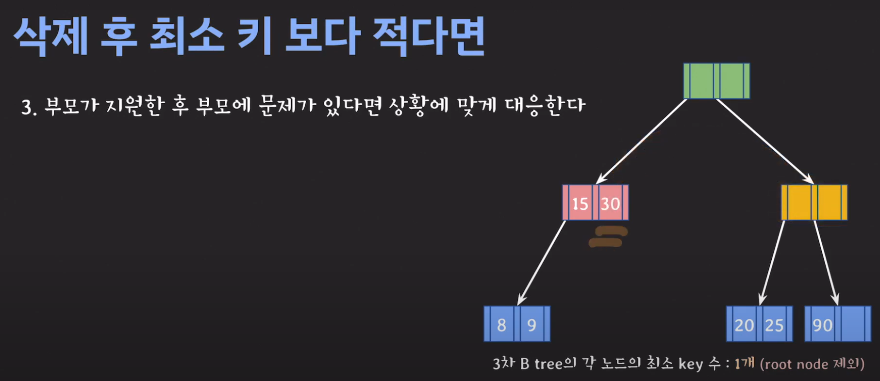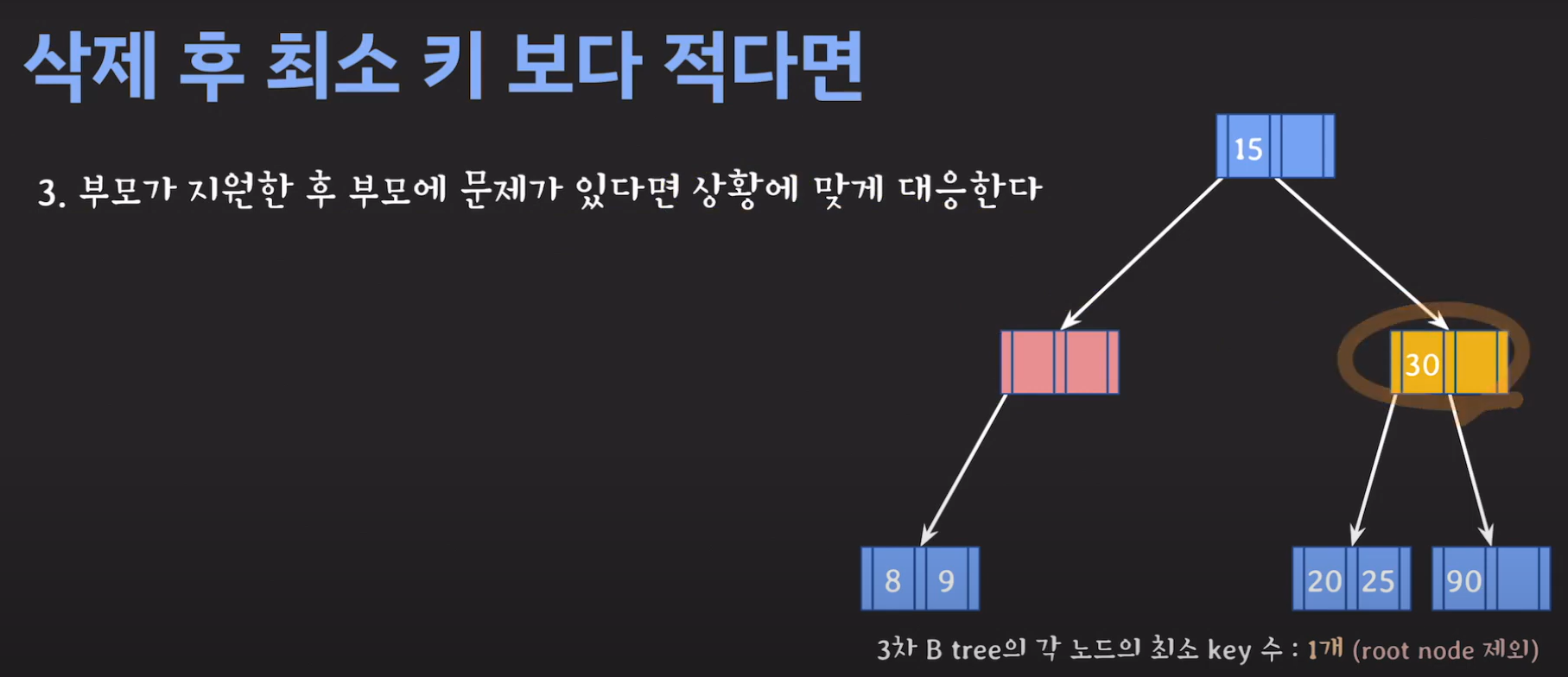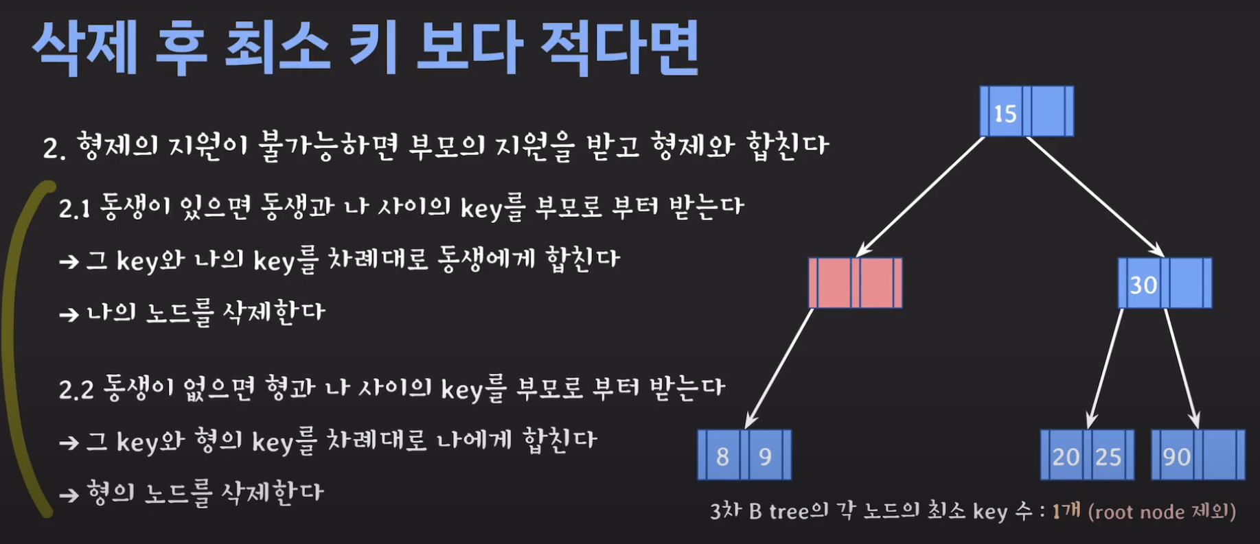 이때 최소 key 조건을 만족하지 않으므로 재배치 해주어야 합니다. 형은 없고 동생은 여유치 않으므로 부모님께 말씀드려야 합니다. 동생과의 사이값(30)을 부모님으로부터 받고 동생쪽으로 합칩니다.