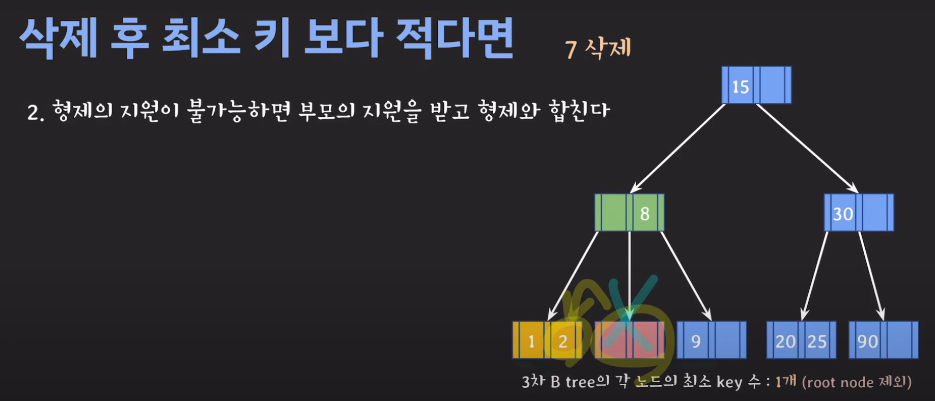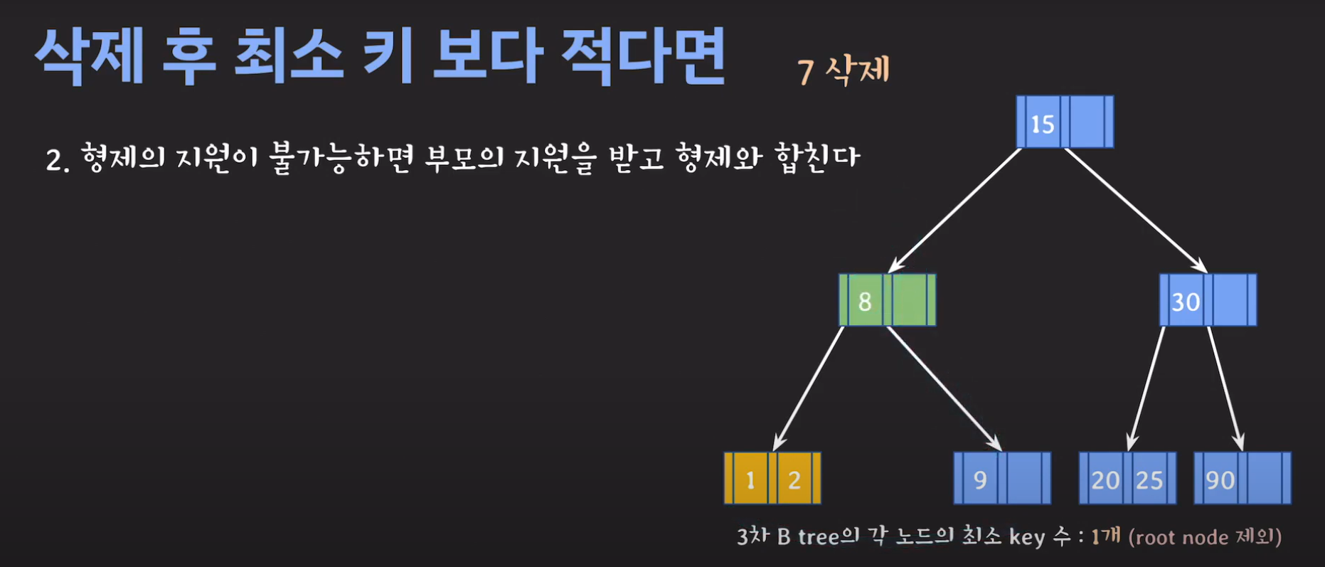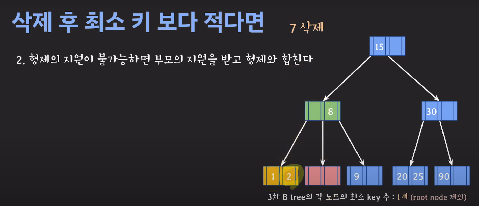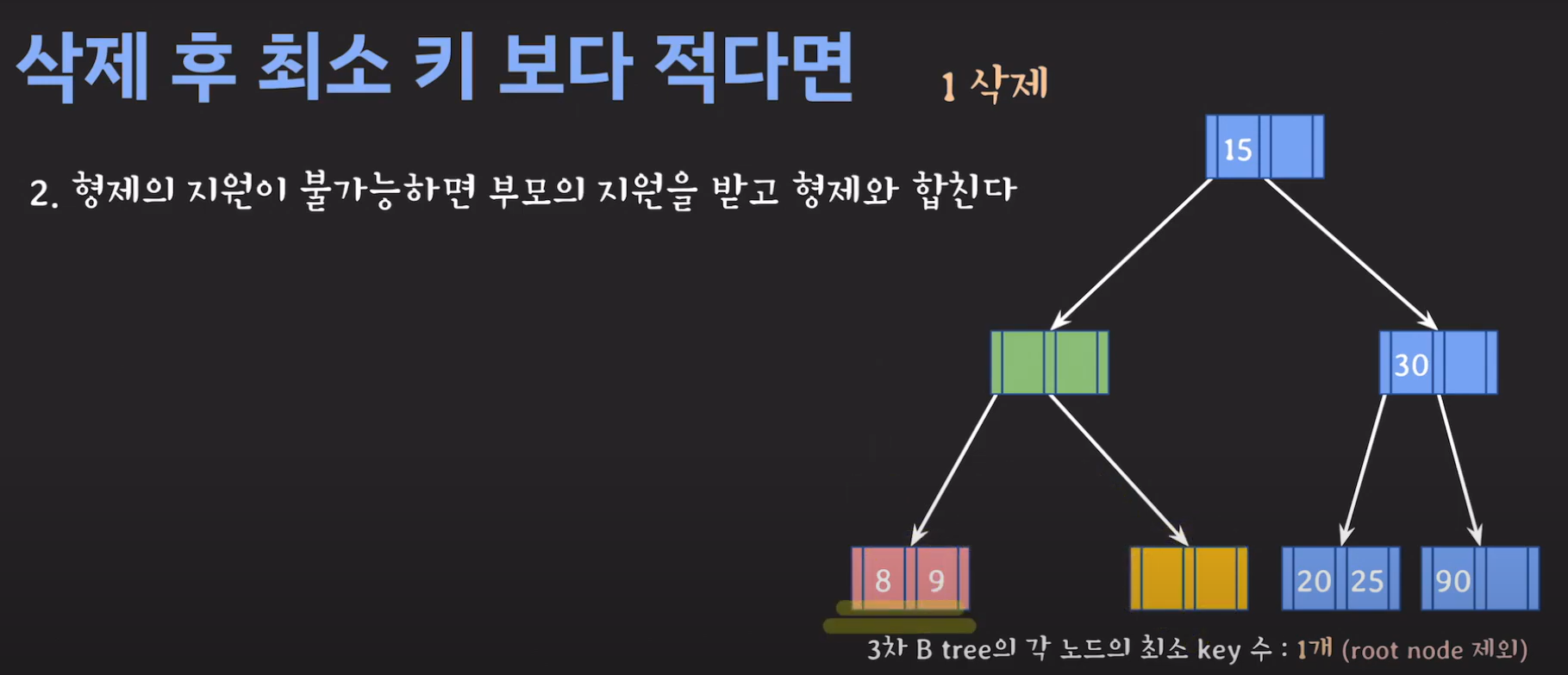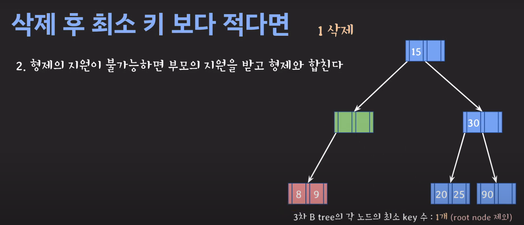 이때 최소 key 조건을 만족하지 않으므로 재배치 해주어야 합니다. 형은 없고 동생은 여유치 않으므로 부모님께 말씀드려야 합니다. 동생과의 사이값(30)을 부모님으로부터 받고 동생쪽으로 합칩니다.
