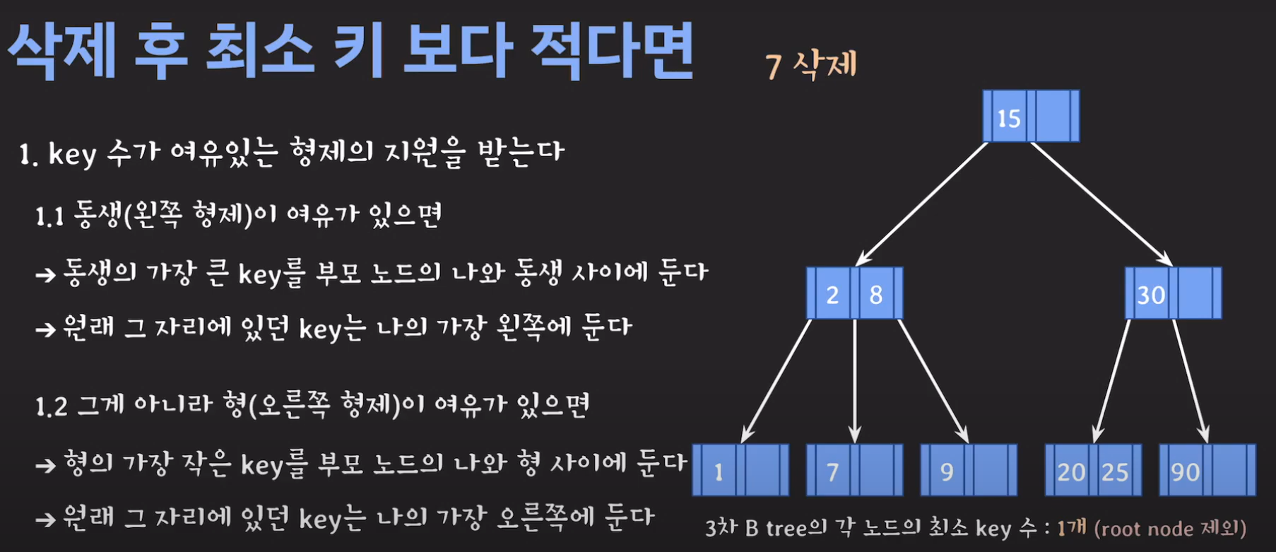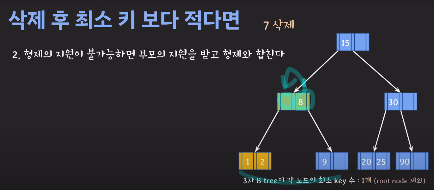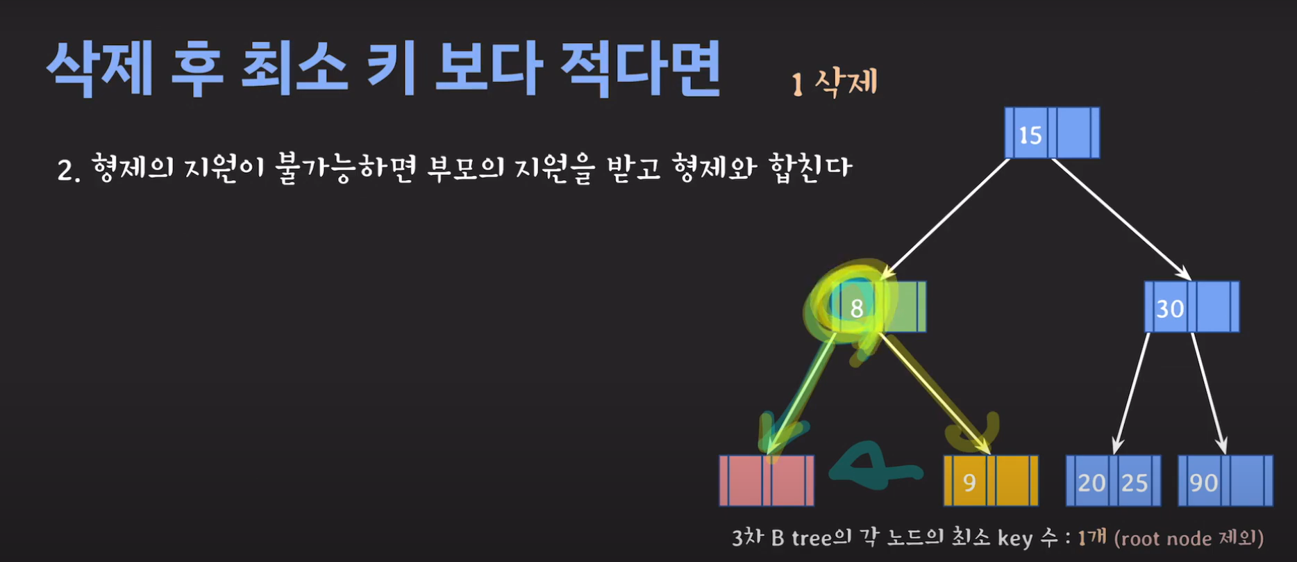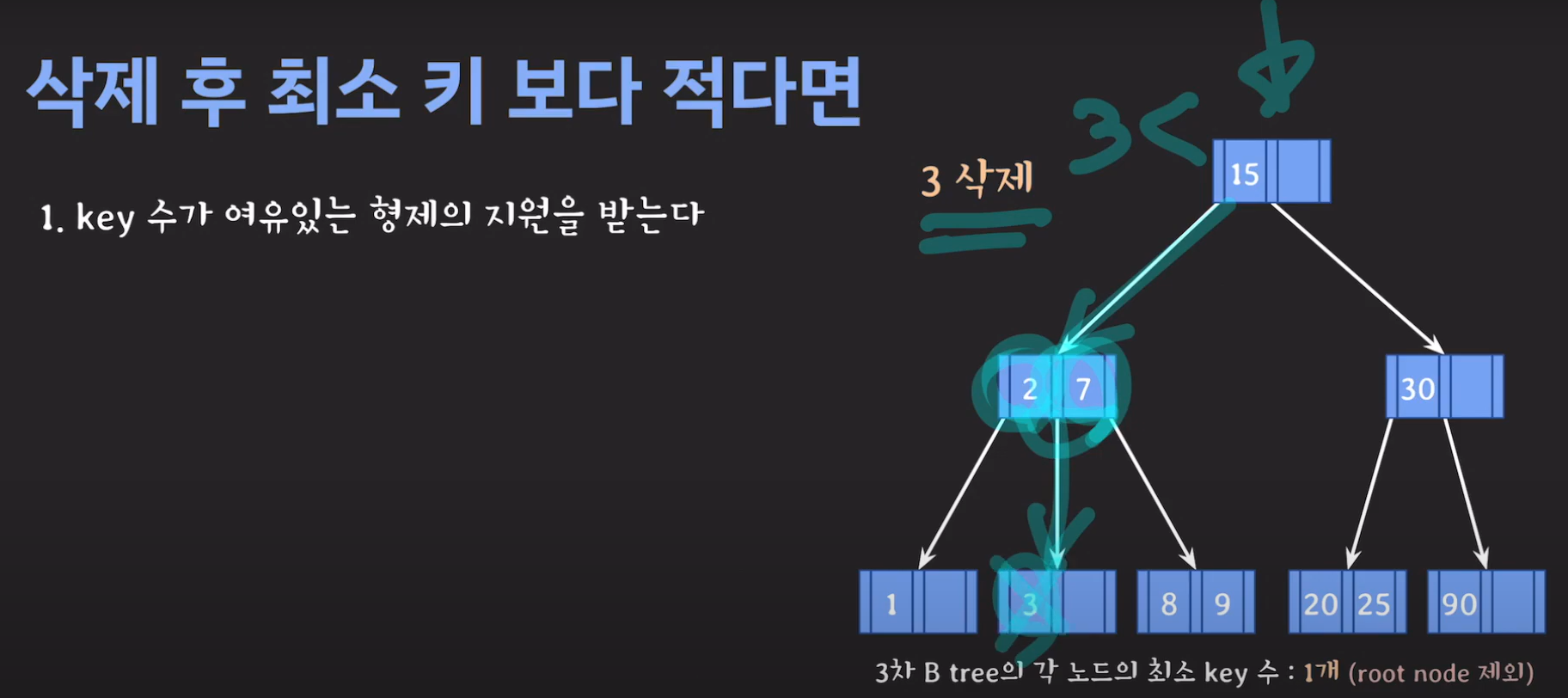 이때 최소 key 조건을 만족하지 않으므로 재배치 해주어야 합니다. 형은 없고 동생은 여유치 않으므로 부모님께 말씀드려야 합니다. 동생과의 사이값(30)을 부모님으로부터 받고 동생쪽으로 합칩니다.