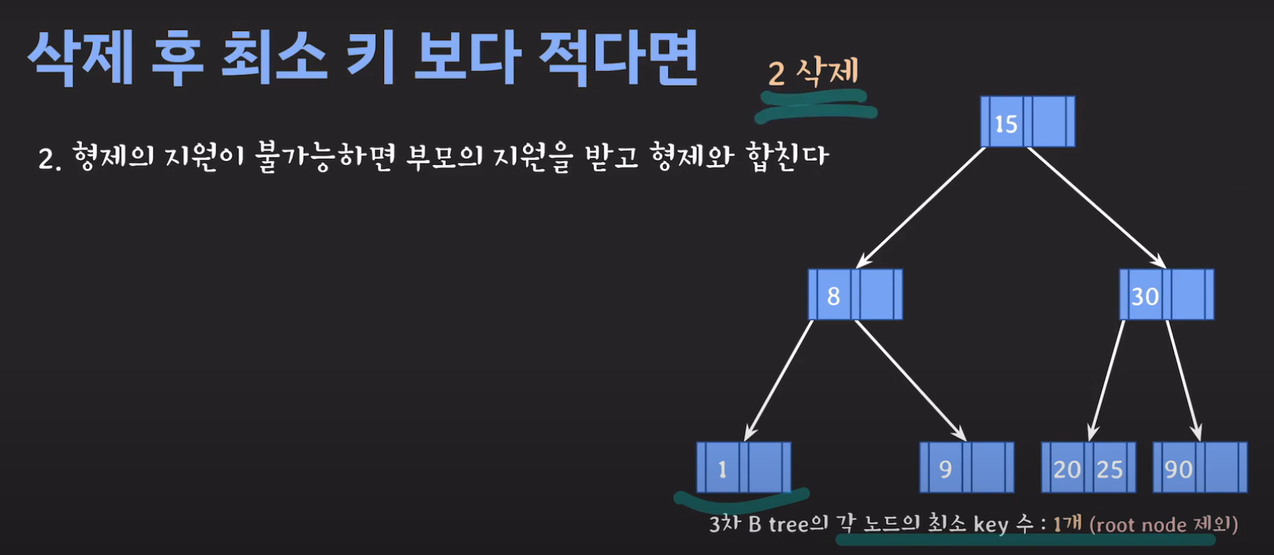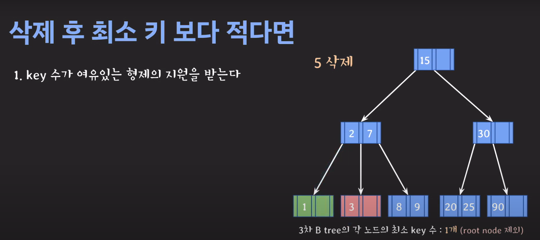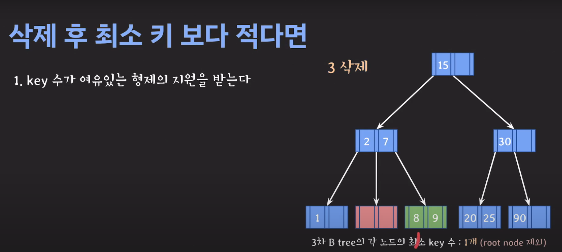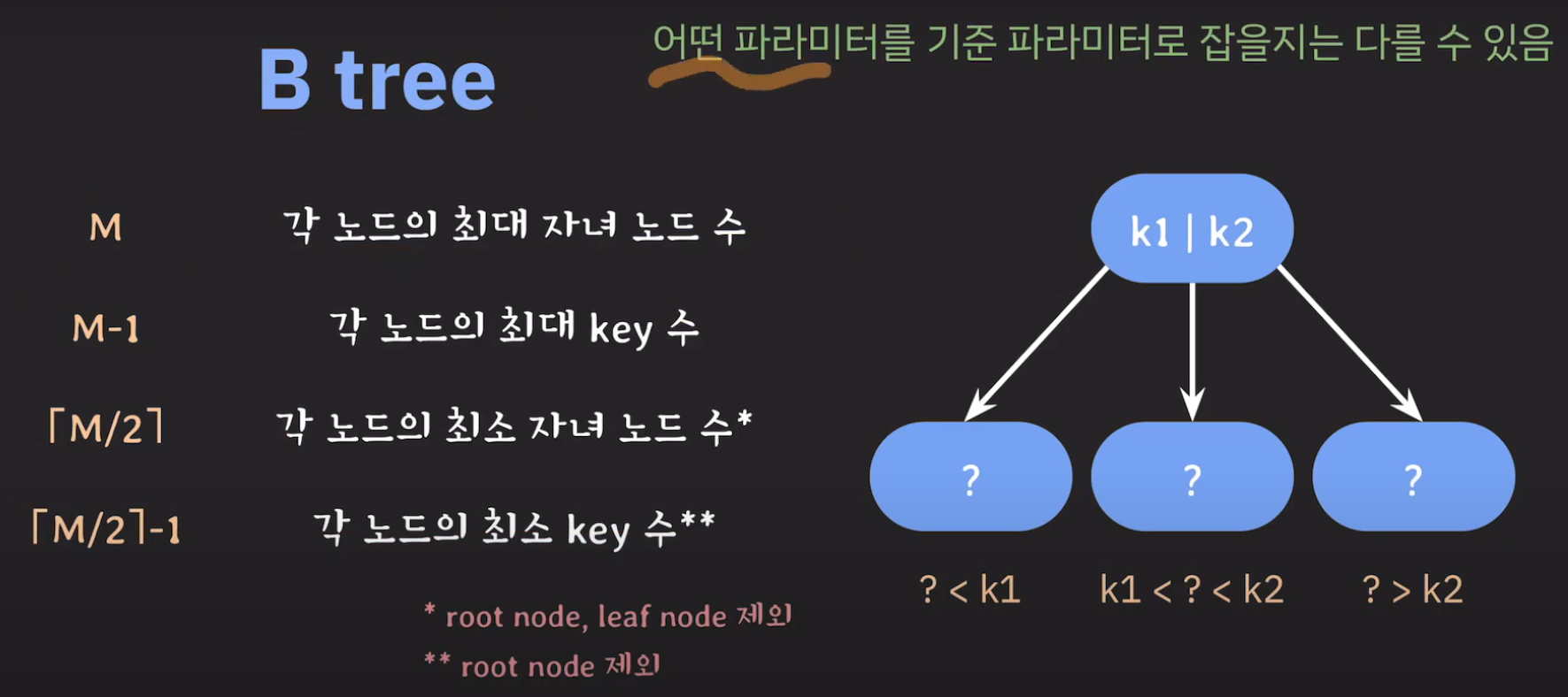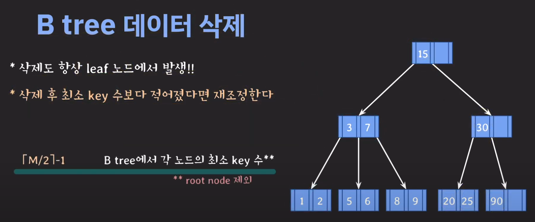 루트 노드는 최소 자녀수를 2개 가질 수 있으며 최소 key는 1개를 갖을 수 있습니다.