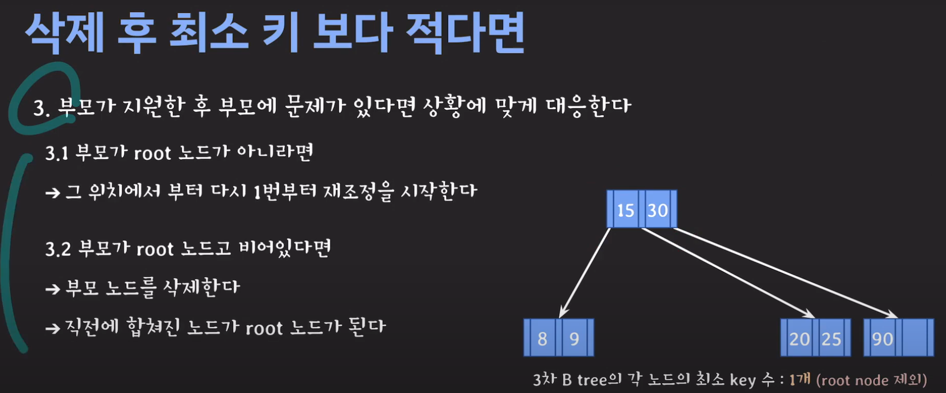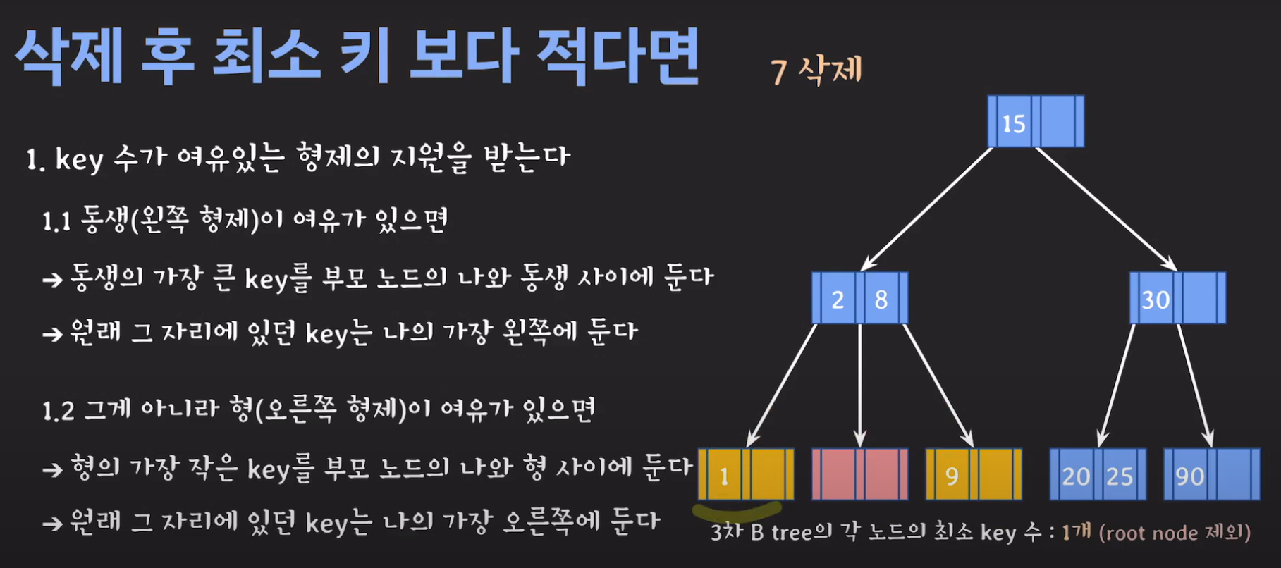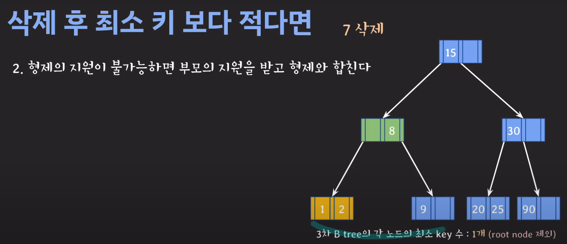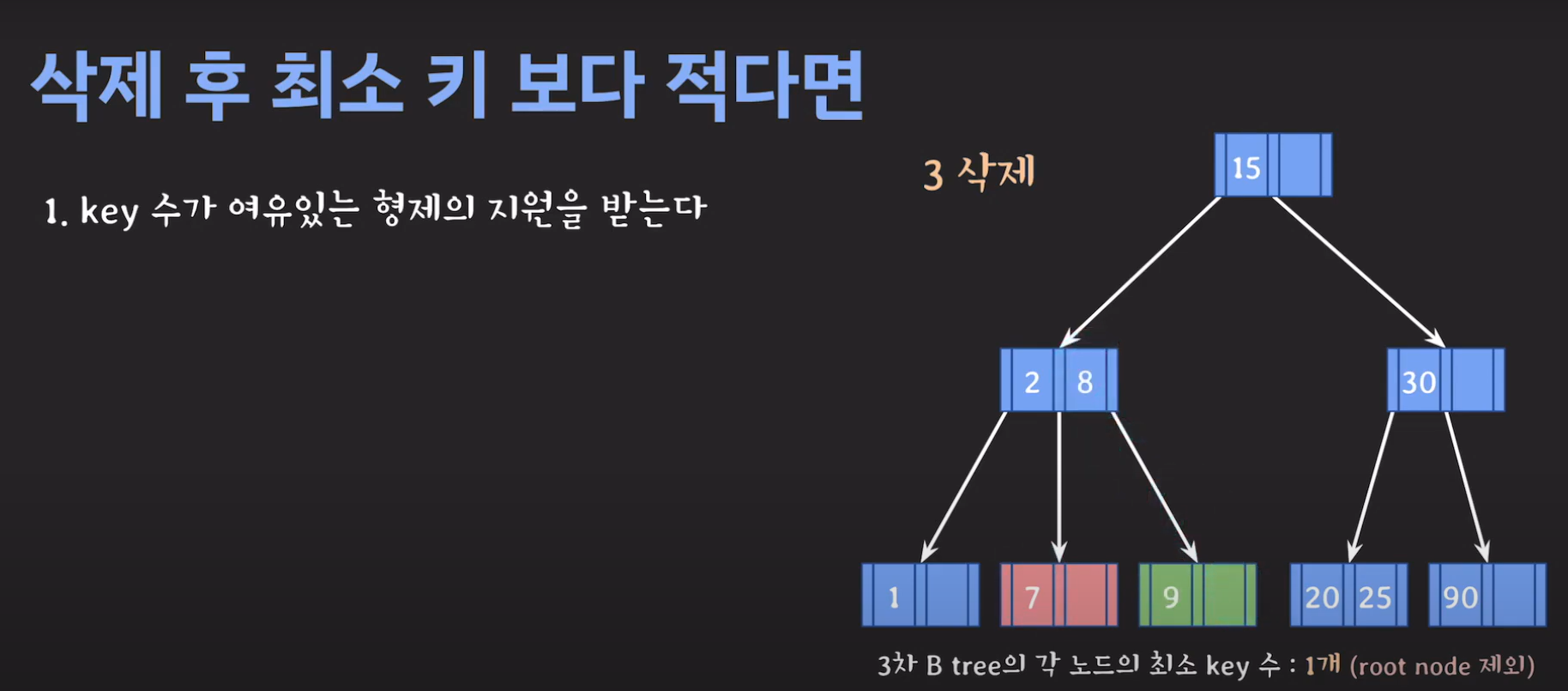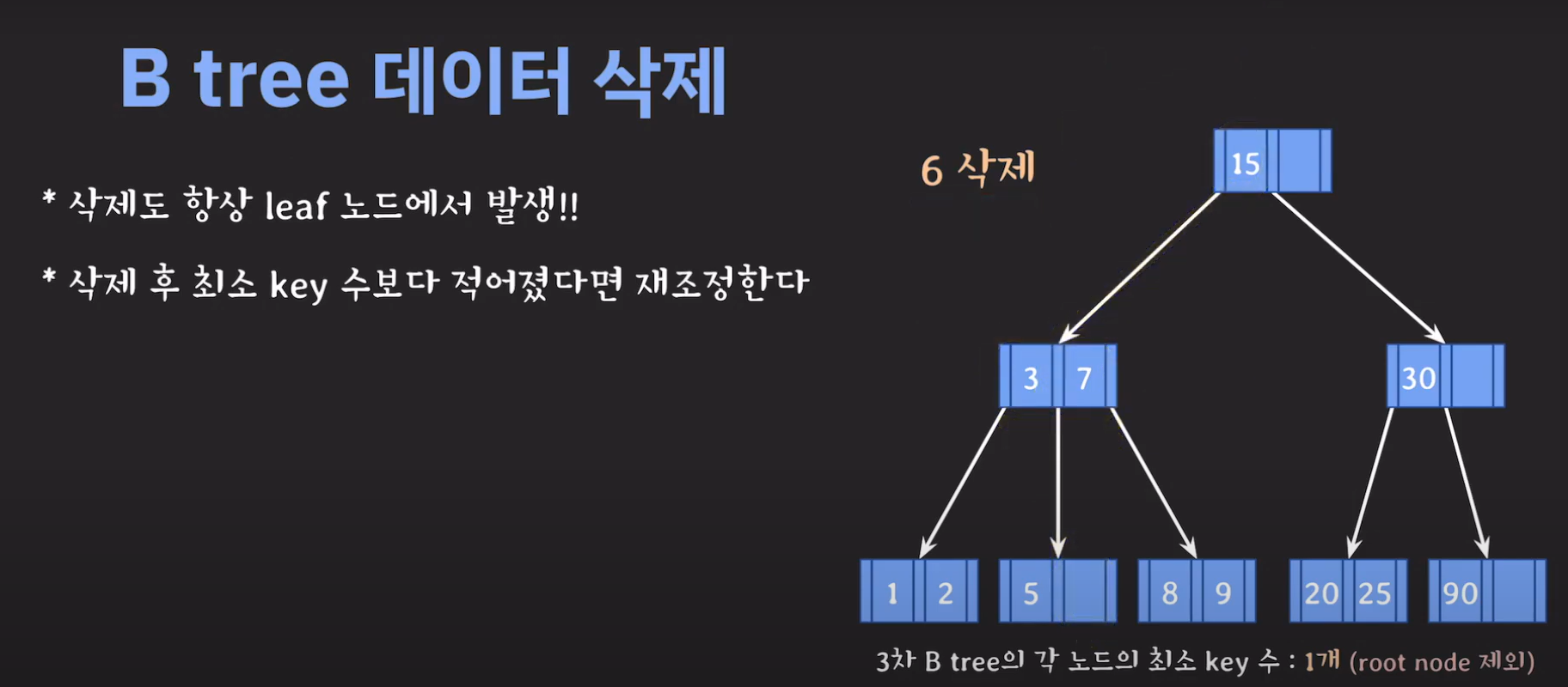 루트 노드는 최소 자녀수를 2개 가질 수 있으며 최소 key는 1개를 갖을 수 있습니다.