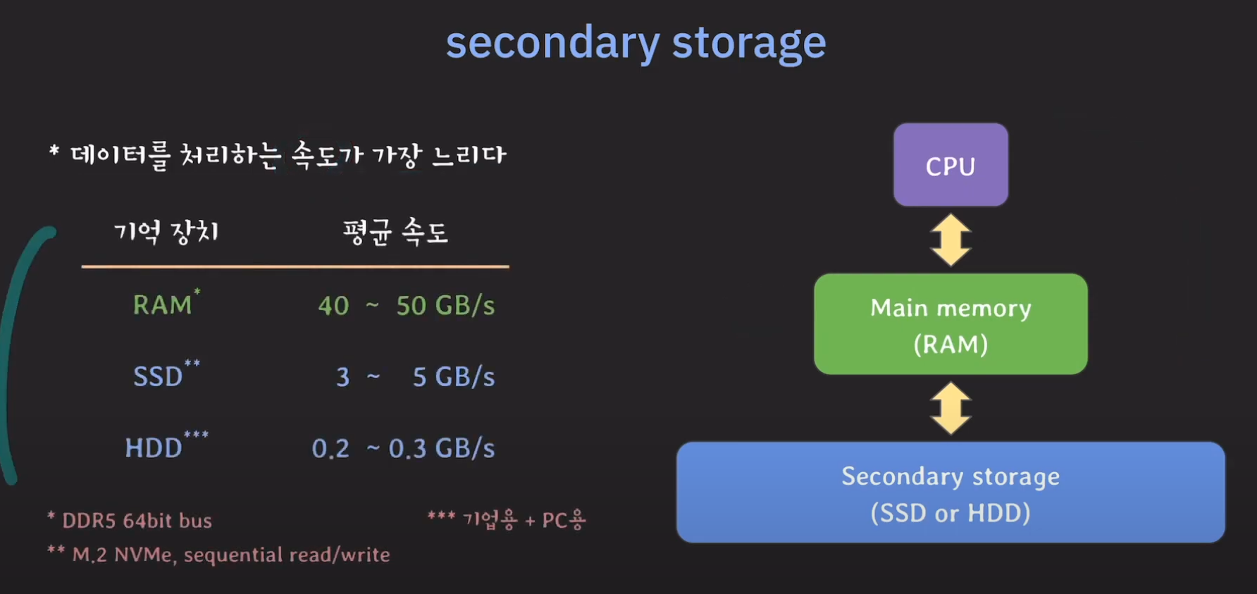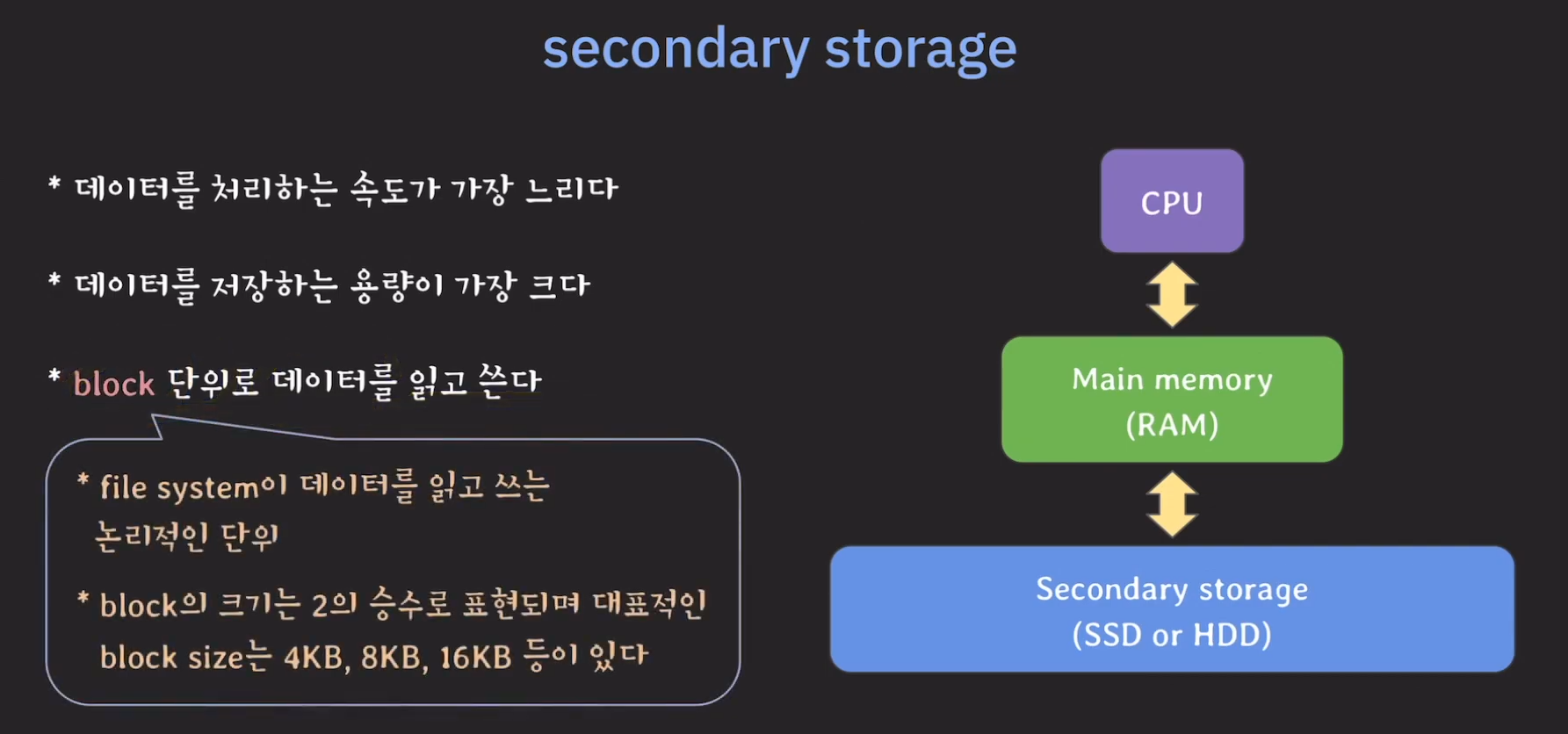 Secondary Storage의 특징을 살펴봅시다.