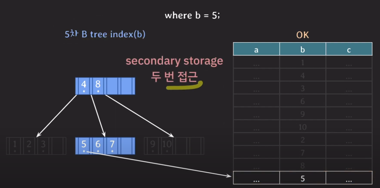 B tree 기반 인덱스는 최종적으로 Secondary Storage에 두 번 접근하게 됩니다.