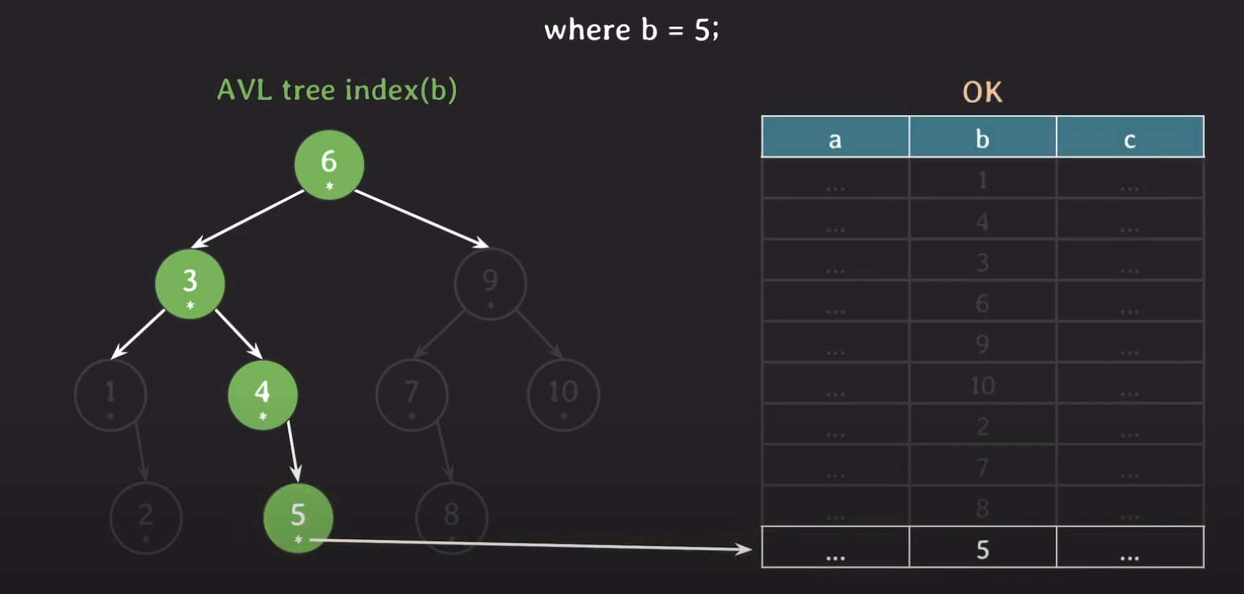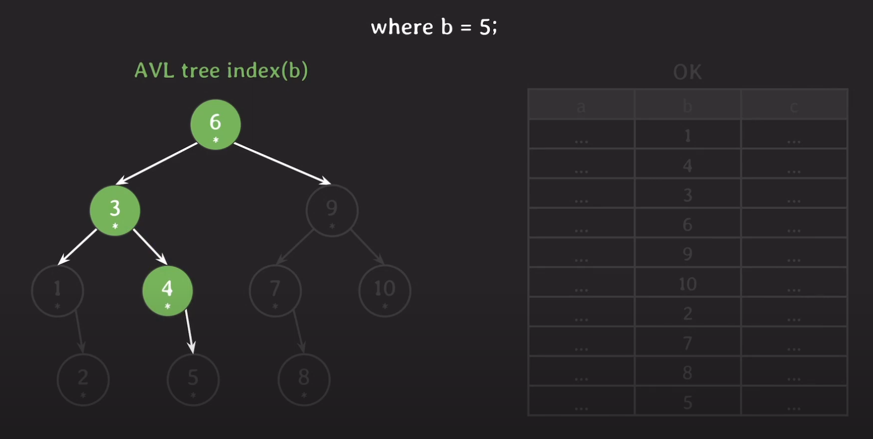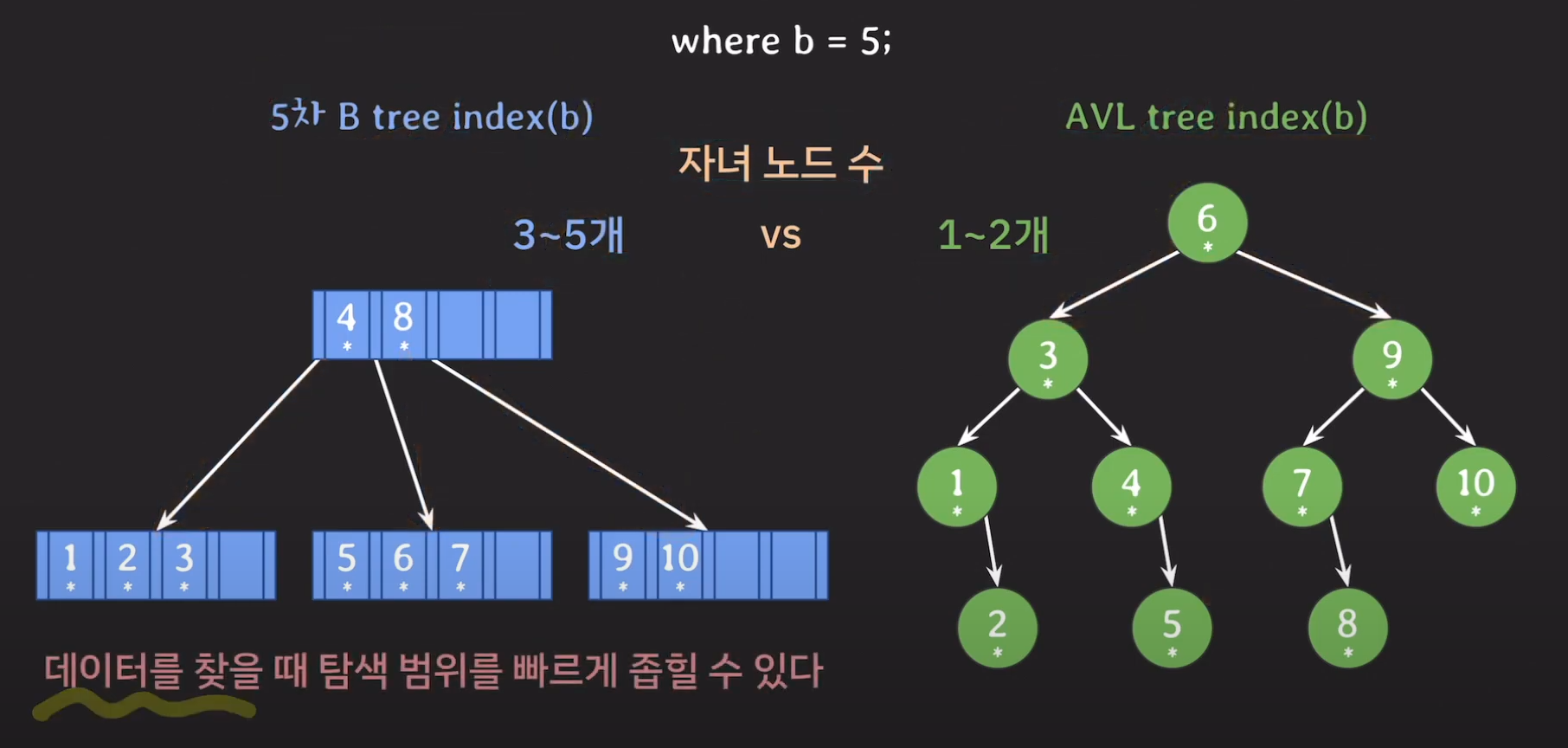 자녀 노드 수를 비교했을 때 B tree기반의 인덱스는 3~5개를 갖는 반면 AVL Tree는 1~2개의 자식만 갖게 됩니다. 따라서 AVL Tree의 경우 왼쪽 혹은 오른쪽으로 밖에 갈 수 없으므로 탐색 범위가 절반씩 줄어들게 됩니다.