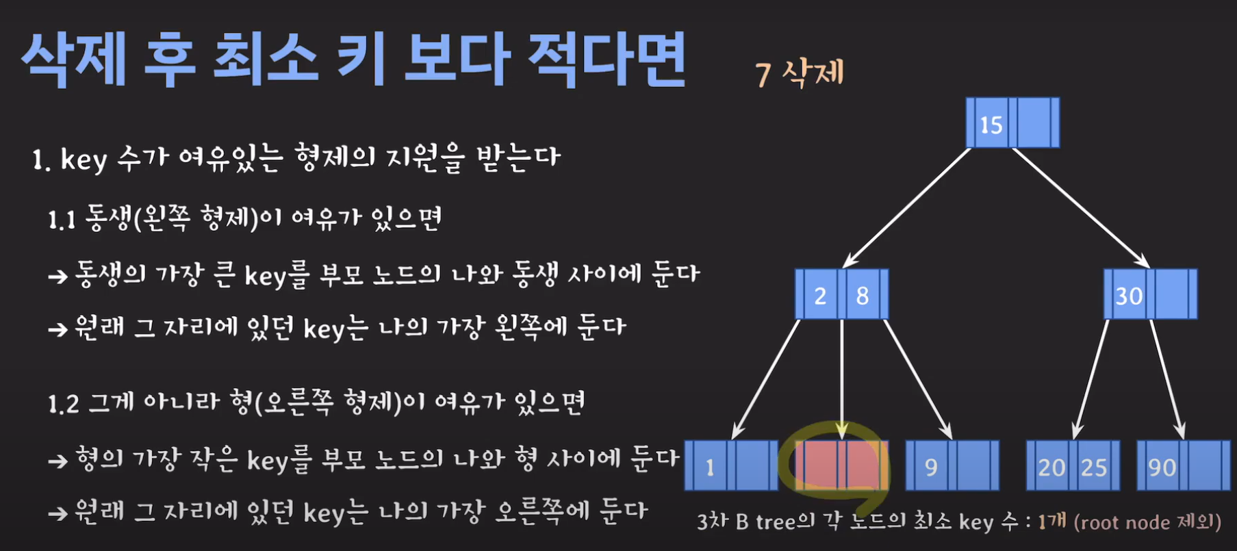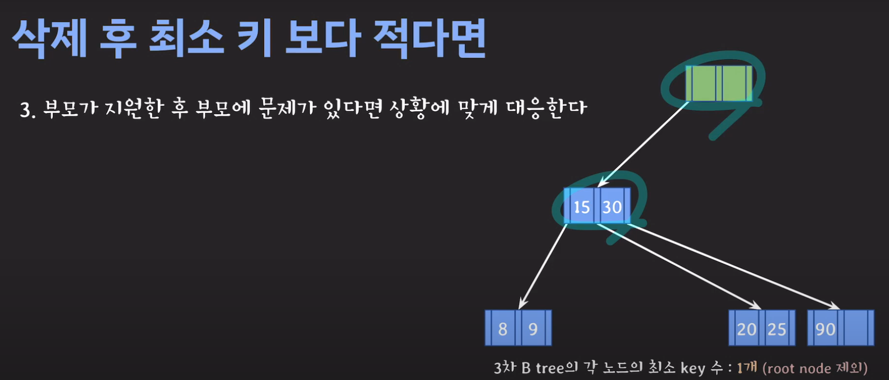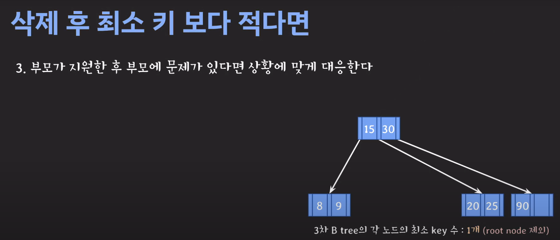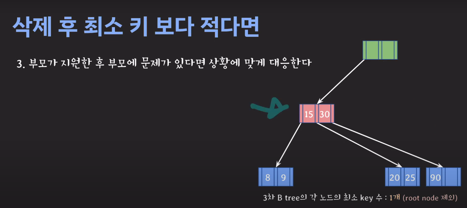 부모의 데이터 수가 조건을 만족하지 않는것을 알 수 있습니다. 이 경우 역시 재배치를 해주어야 합니다.